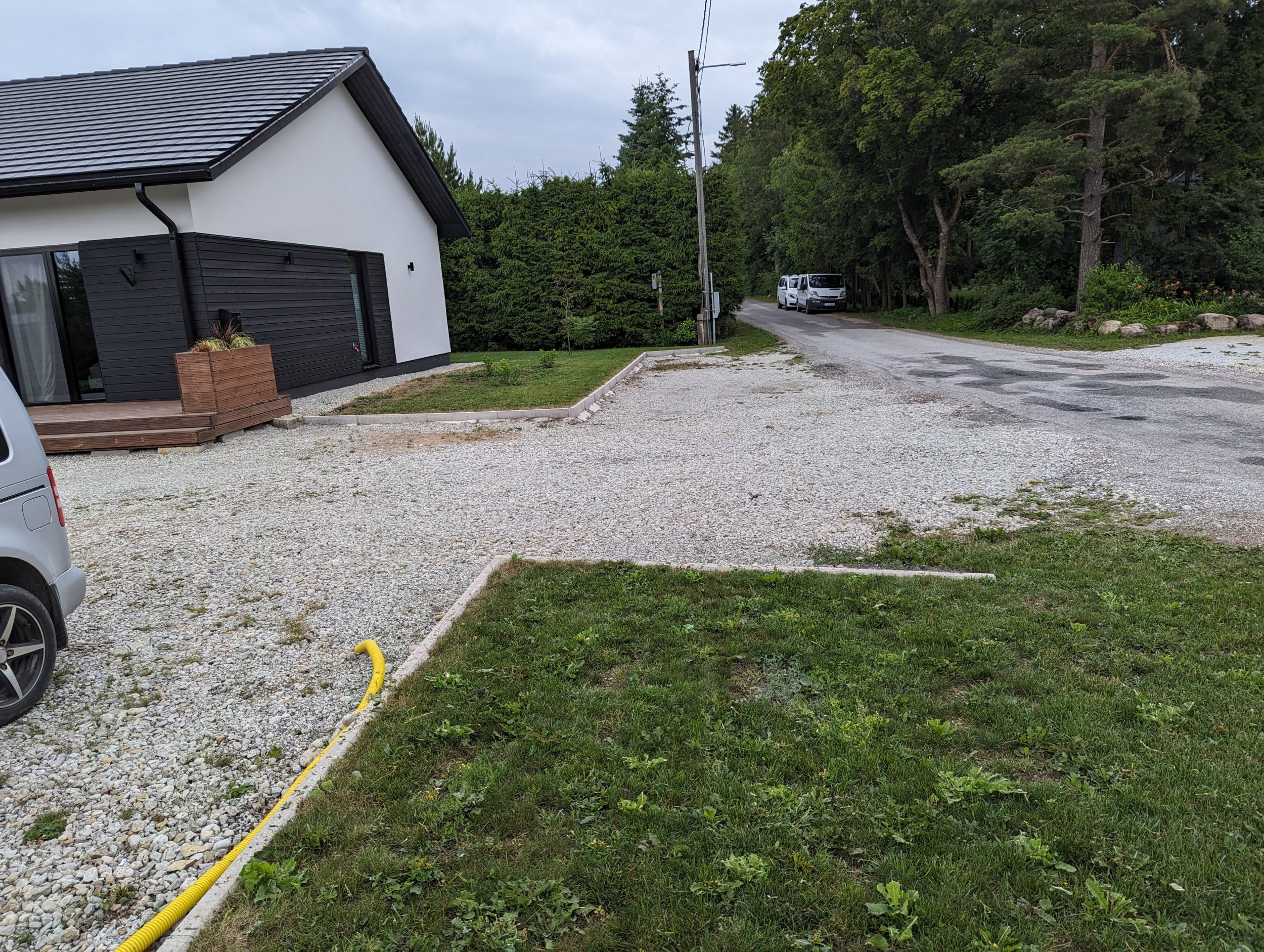 tervitus, pakkumine sisaldab äärekivide paigaldust kuni asfdini, roheliste kohtade välja kaevamine, utiliseerimine ja killustiku lisamine, paesõelmed, pinnase tihendus, kivide paigaldus, lõikus, liivatamine tihendamine, asfaldi sirgeks lõikamine ja vajadusel uue külm asfaldi lisamine, kõik tehnika ja muu vajaminev meie poolt, ettemaksu ei vaja tööle garantii 3 aastat kogemust 13 aastat ja töö kestab umbes 4 päeva