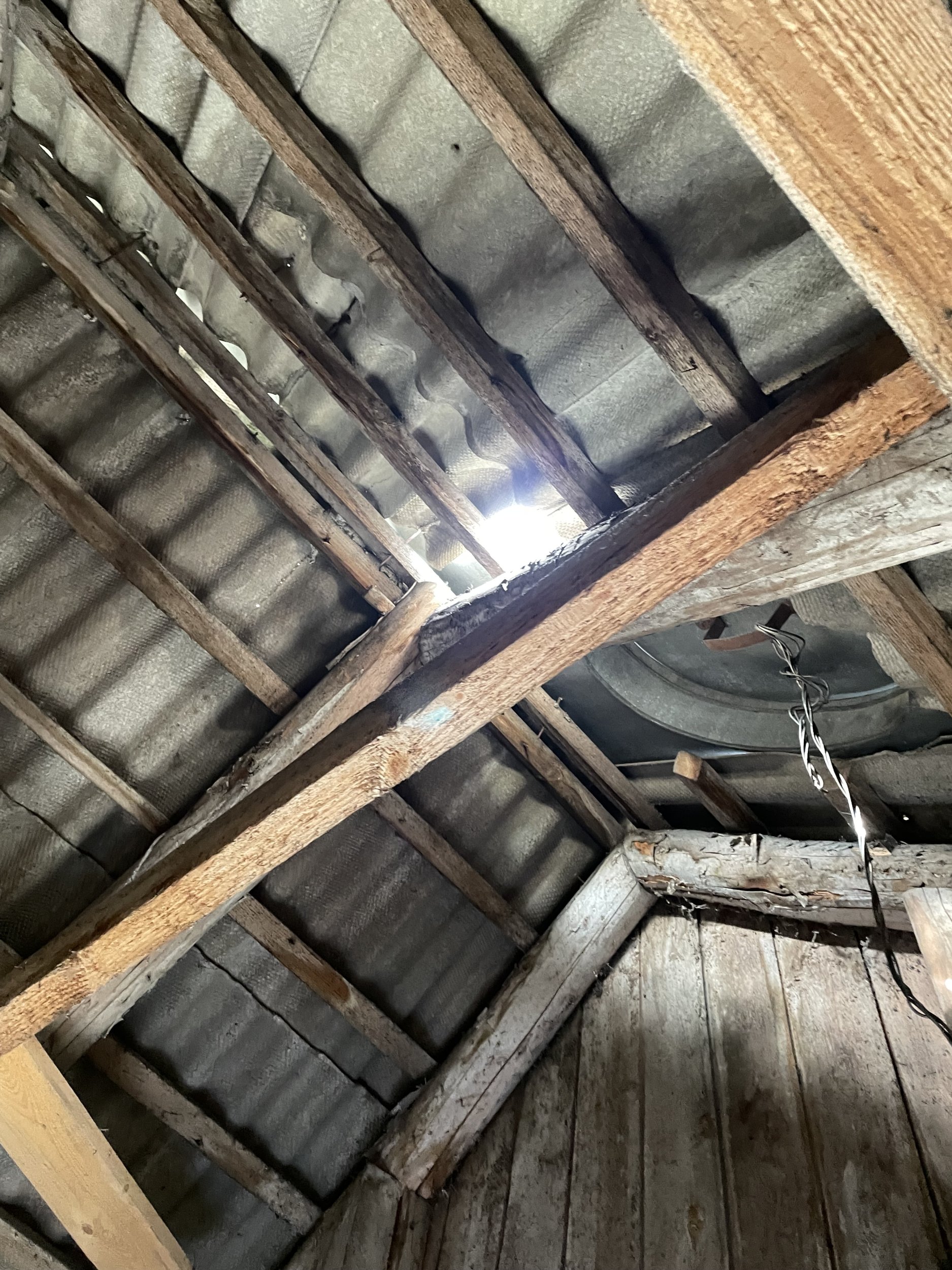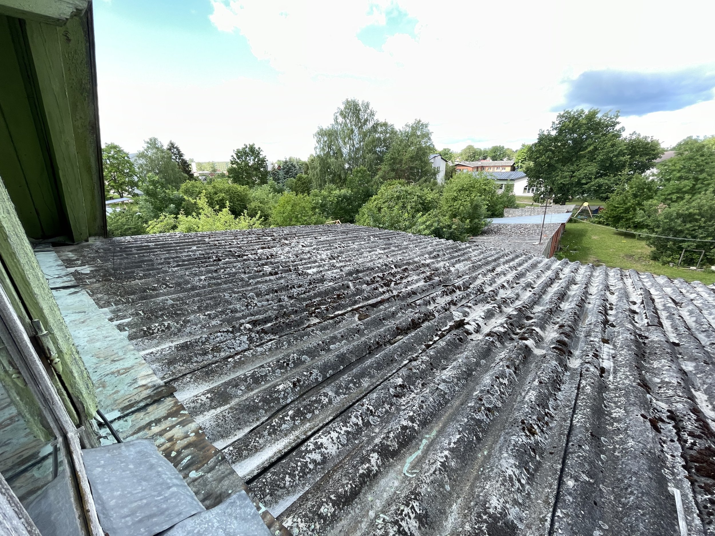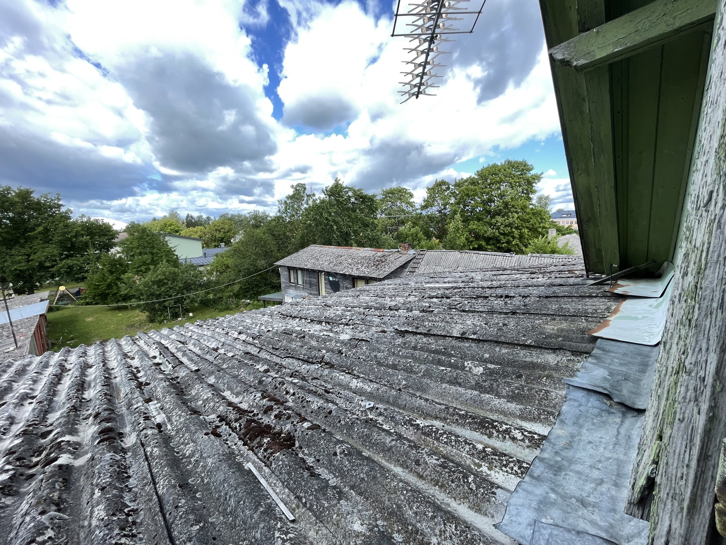 Korterelamu vana eterniitkatte vahetus pleki vastu.