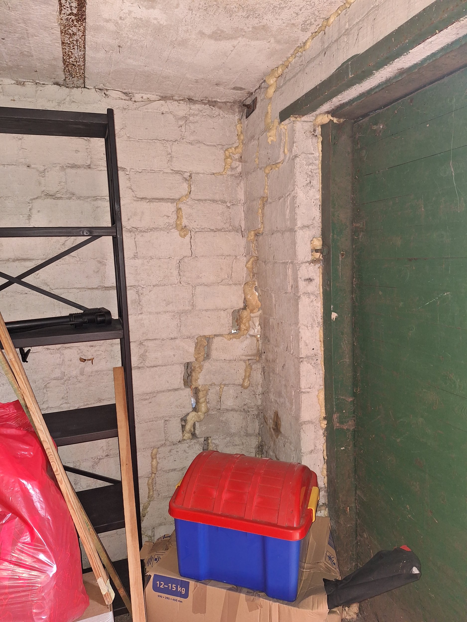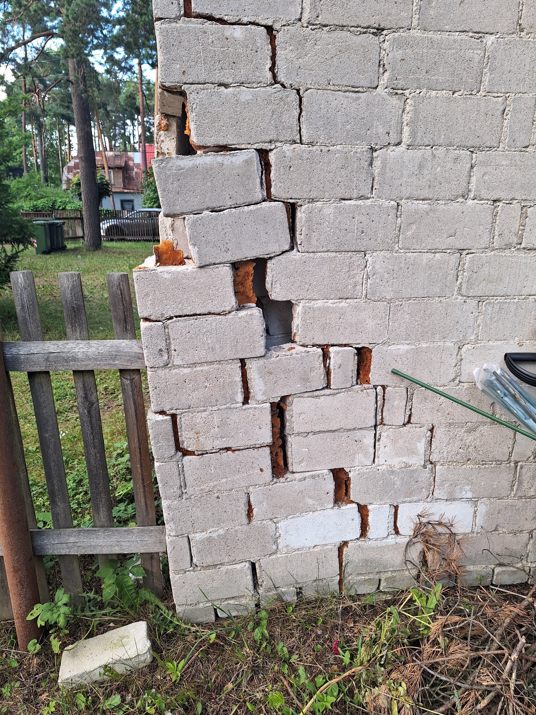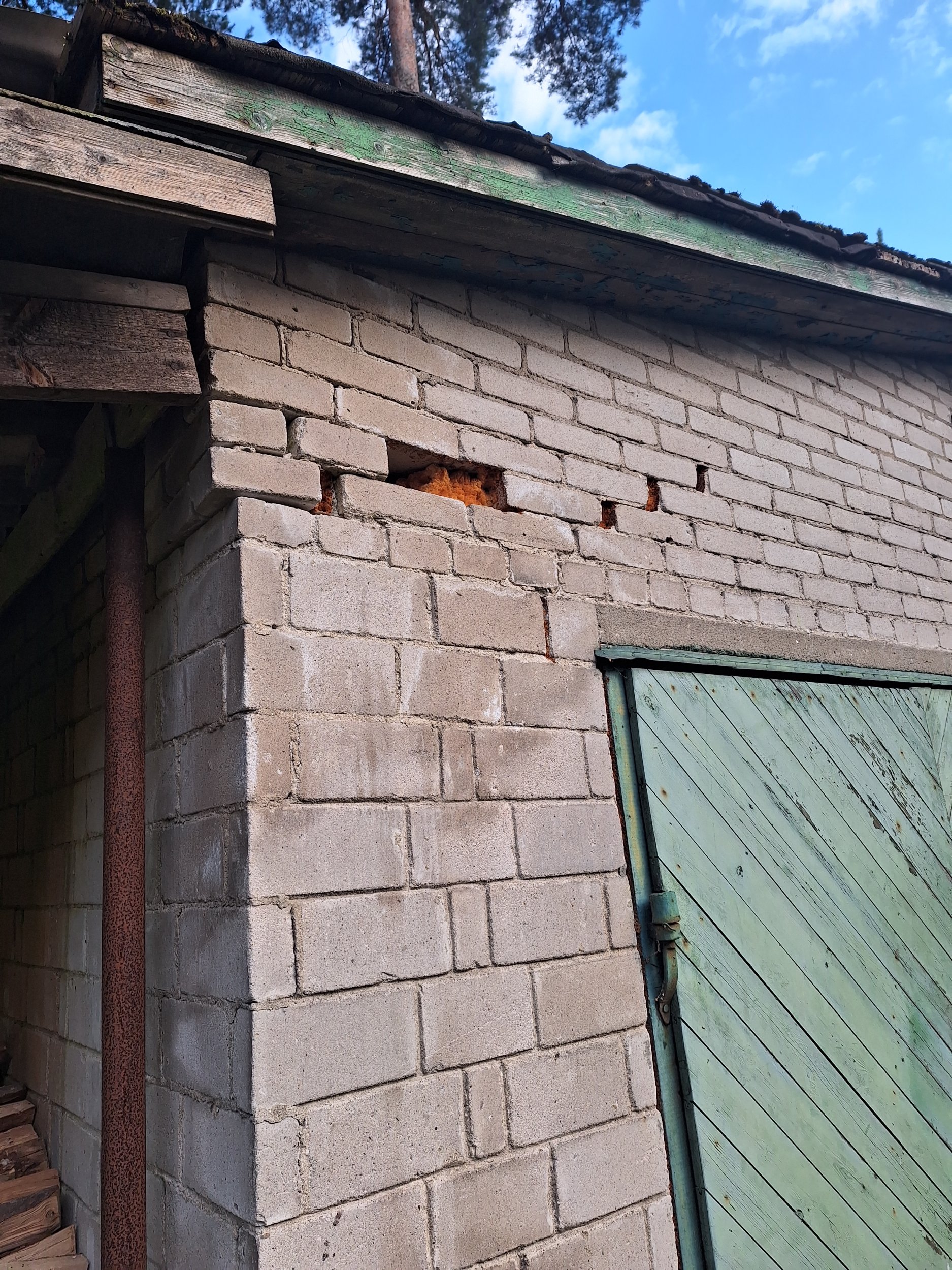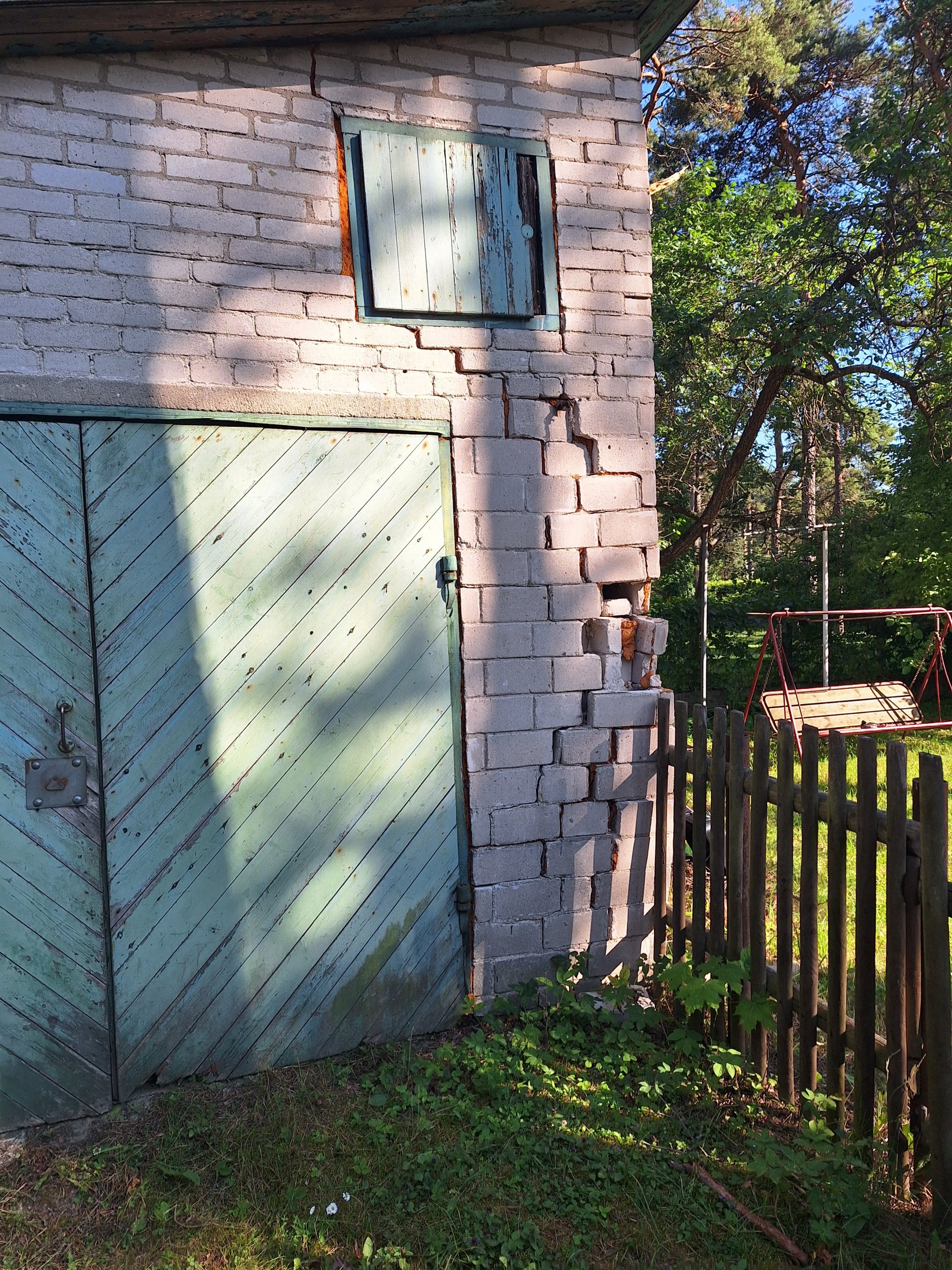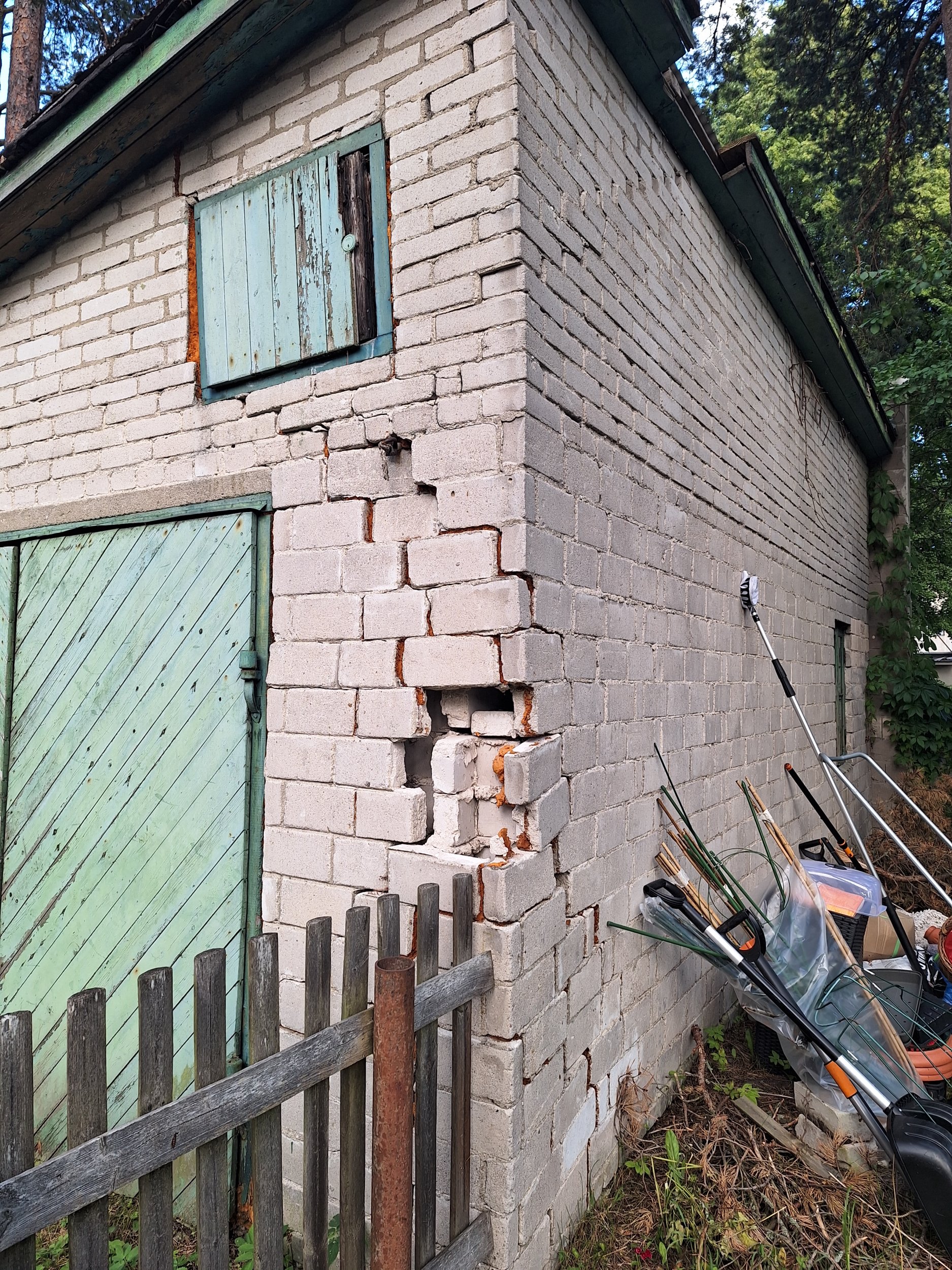 Telliskivist seintega ja betoonist katusega garaaži üks nurk on sisse vajunud (sest tormiga kukkus ümber puu, mis maandus just garaaži nurka). Vaja on sein taas korda saada, katusel ei paista vigastusi olevat. Garaaž asub Tallinnas Nõmmel. Kunagi on seda nurka «remonditud» makrofleksiga, kui kaua garaaž sellises seisus on, ei tea, sest alles omandasime selle vara.