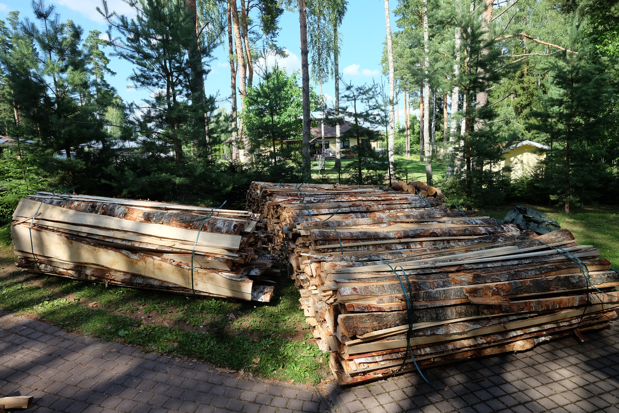 Hoovi peal on 6 pakki kasepinde (rihmaga kokku pandud, pinnud üksteise vastas ja paralleelsed). Iga pakk 3 RM ja 3 pikk. Need oleks vaja saagida 50 cm pikkusteks küttepuudeks (seega igale pakile on vaja teha 5 lõiget).