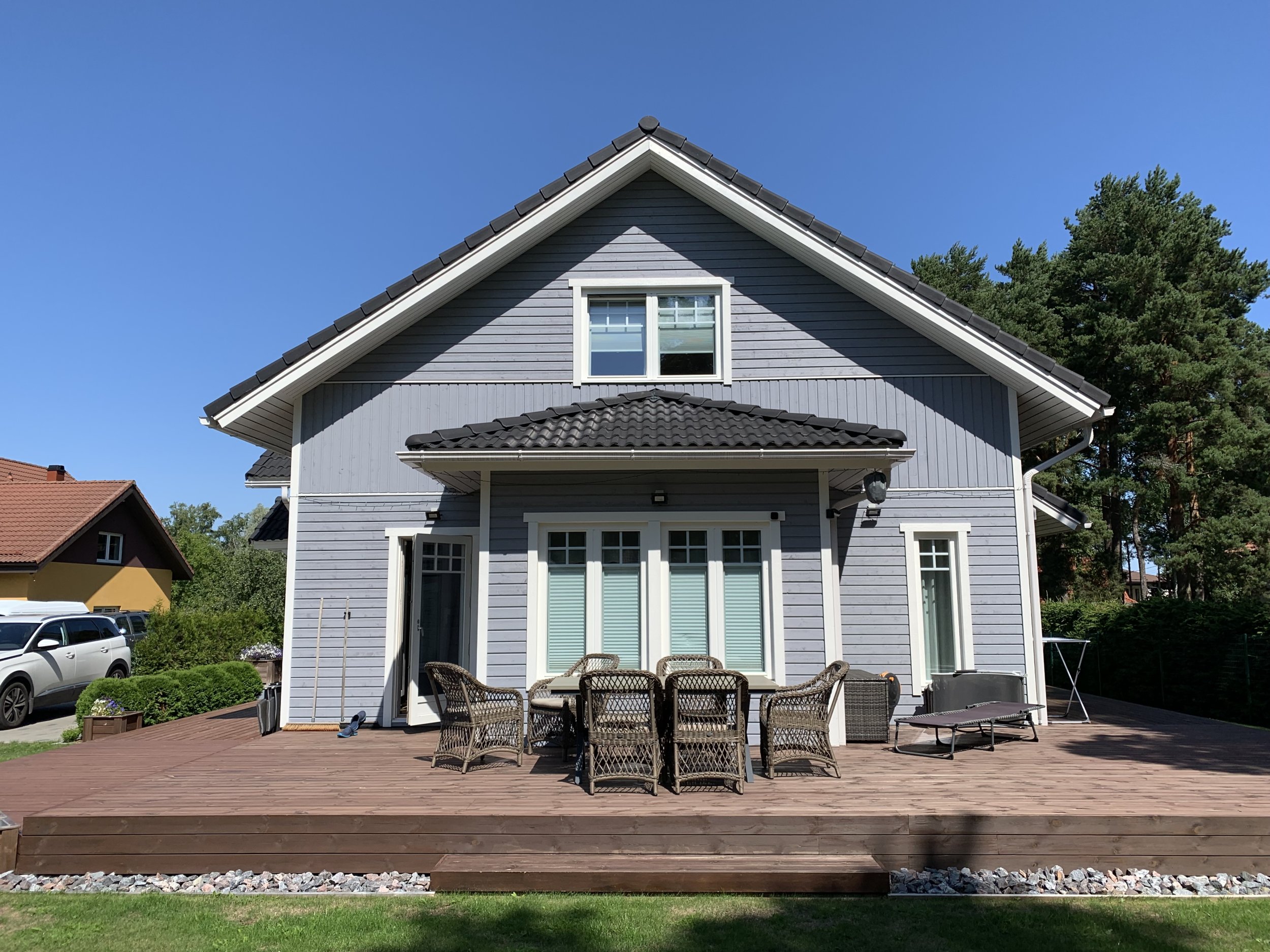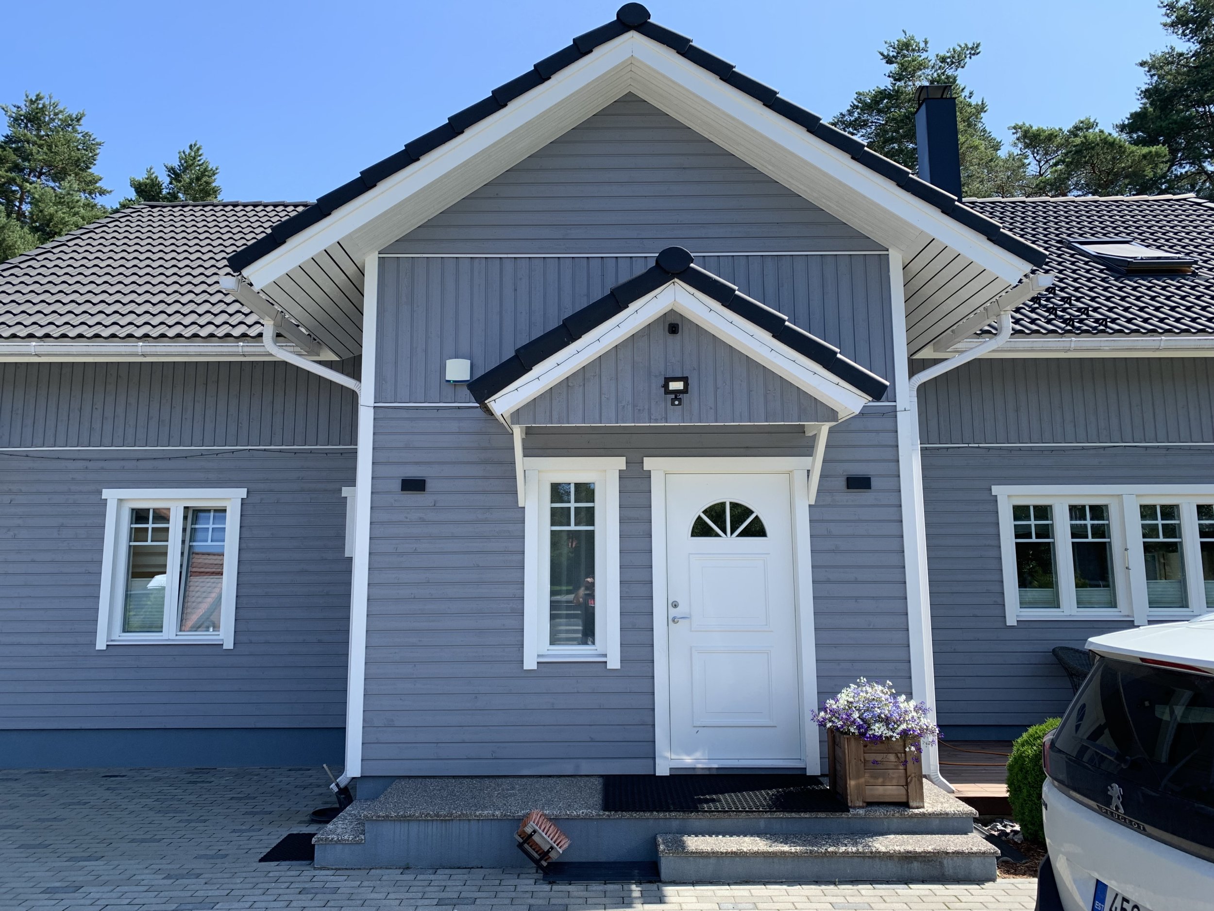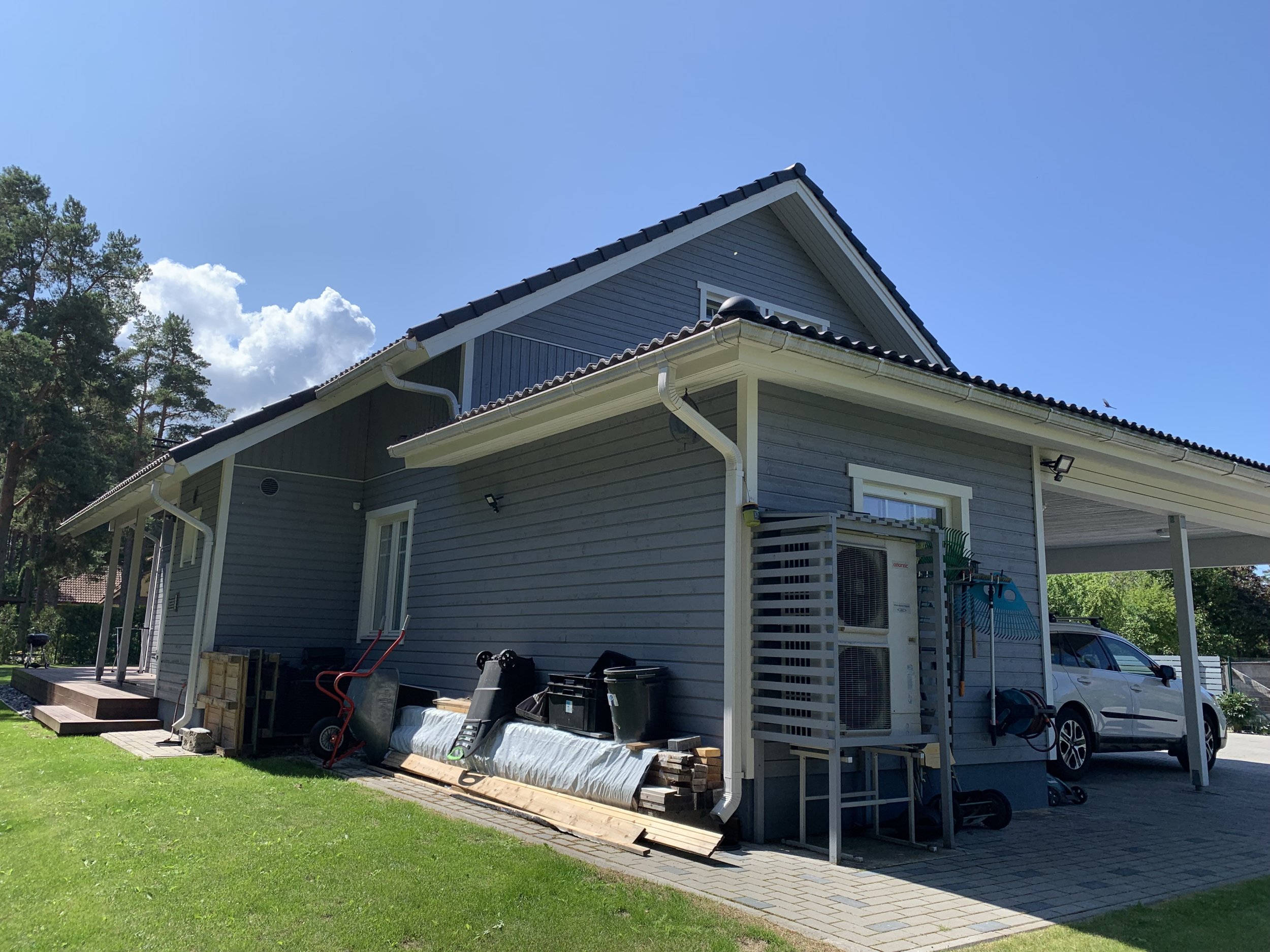 Maja fassaadi värvimine, värv - https://espak.ee/epood/toode/puiduvarv-teknos-nordica-matt-b1-18l/ - toon T7032. Valgete osade teipimine, terassi kattmine.