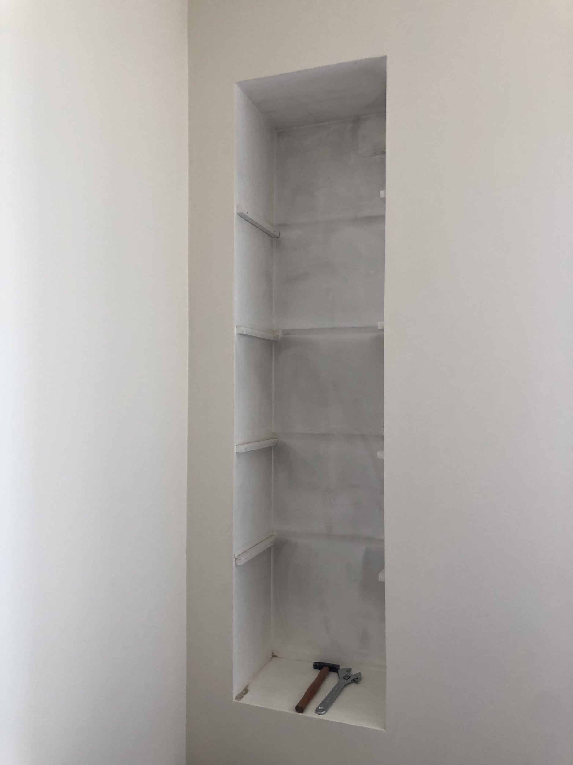 Ühe aknapale viimistlus (kipsi paigaldus, pahteldamine), kahe radiaatorikatte valmistamine ja paigaldus (puitraamis metall-leht, hingedel kinnitus), WC põranda plaatimine (ca 1 m2), ühe ukseraami viimistlus, kipsist seinasiseste riiulite ehitus (seinas auk olemas, neli riiulit ca 30 x 30 cm), kipsist karbiku ehitus kubule (töötasapinnast laeni, all külgedel süvistatud riiulid), istumisala ehitus (ca 2 m x 0.5 m)
