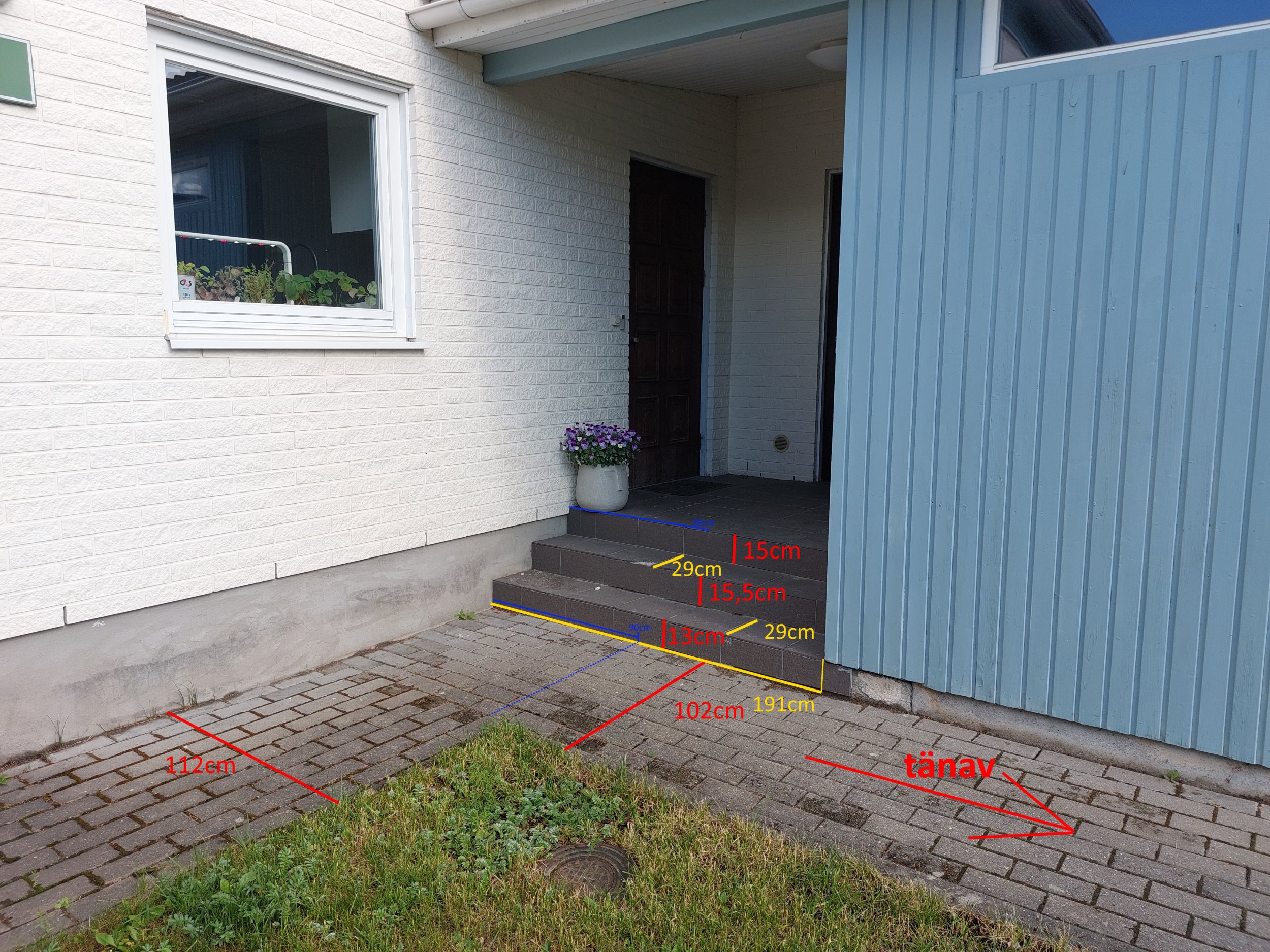 Palun puitkonstruktsiooni, mis toetub olemasolevale trepile ja millele oleks kinnitatud kaldtee, mida mööda saab ratastooli sõidutada otse tänava suunas (teine pildil olev suund viib naabri juurde).