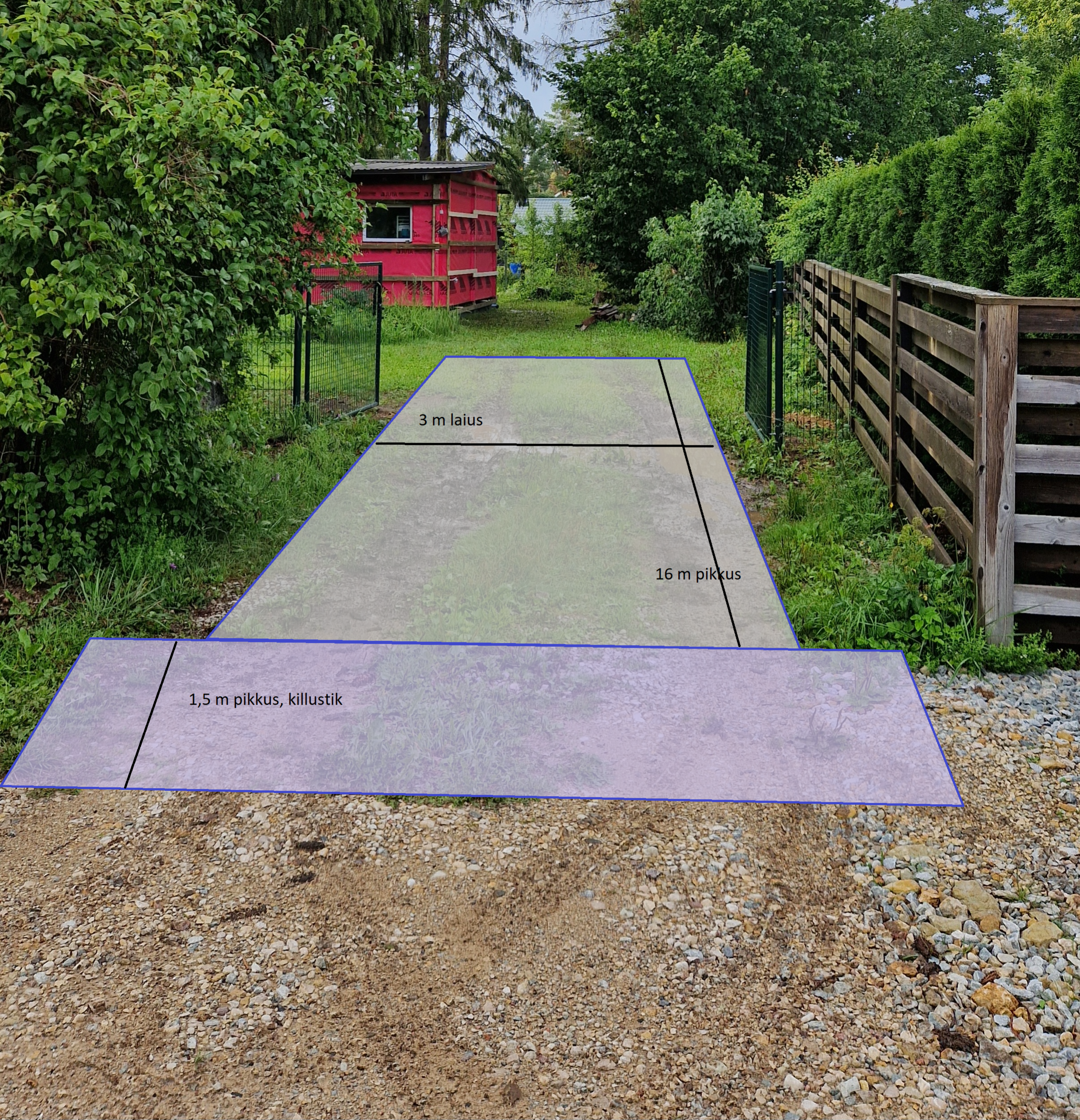 48 m2 tänavakivipaigaldust (murukivi) ja 8m2 kilustik. Äärekivi vaja paigaldada 38 j/m. Pakkumus peab sisaldama kõiki töid ja materjale (murukivi 80 (hall) : https://raekivitehas.ee/tooted/murukivi-80-2/ , killustikalus, äärekive). Osa üles kaevatud pinnast saab laotada aeda, ülejäänud saab ära toimetada lähedal olevale kohale.