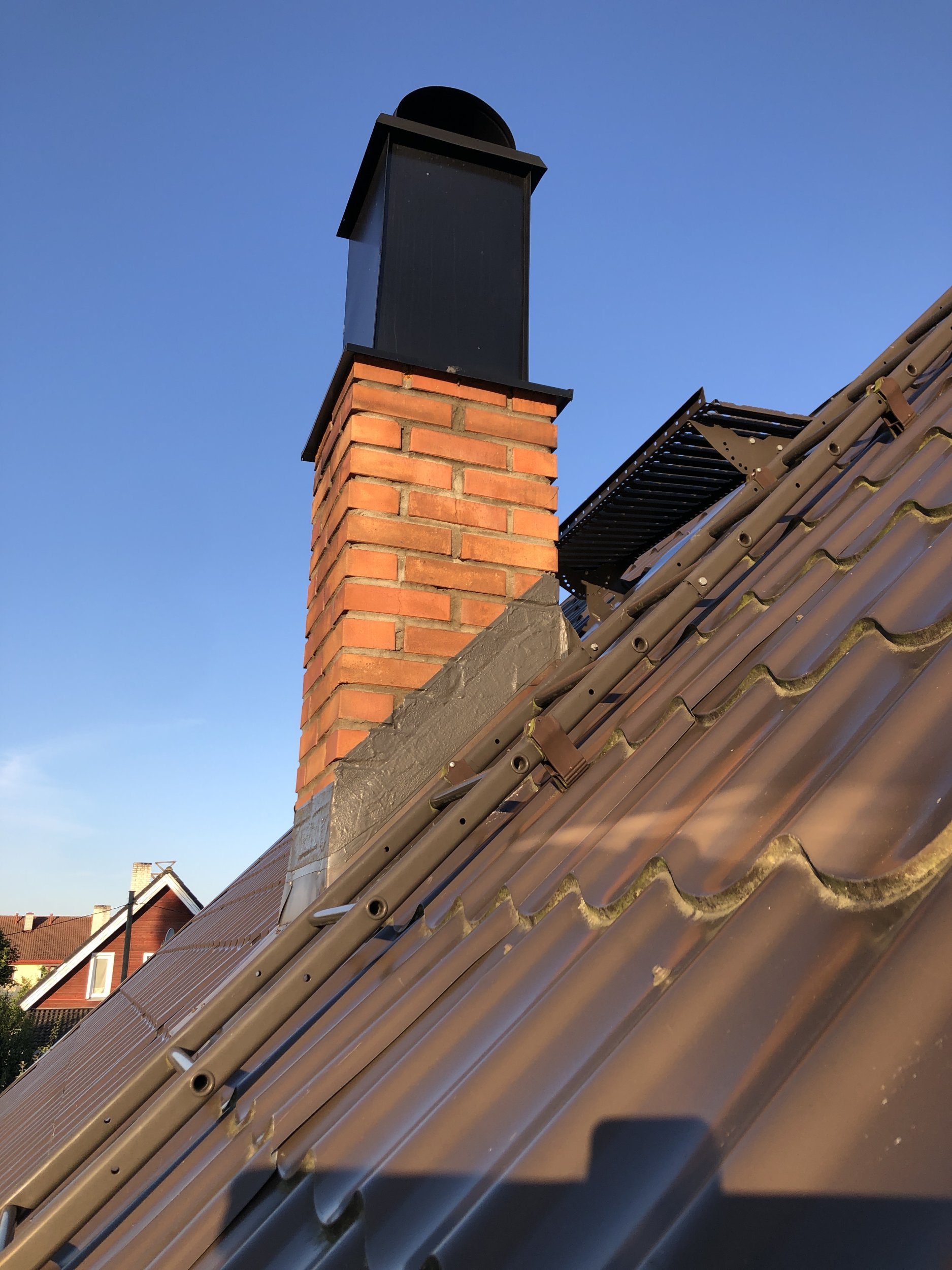 Pits laotud punastest tellistest, kuhu tekkinud paar pisikest pragu. Krohvi alla läheks punaste telliste osa. Pitsi alumine osa on kaetud vedelplastiga. Iseenesest võib ka see krohvi alla jääda, muidu ehk silmale liiga kirju. Ülemine osa on pikendatud moodulkorstna blokkidest ja kaetud plekiga.