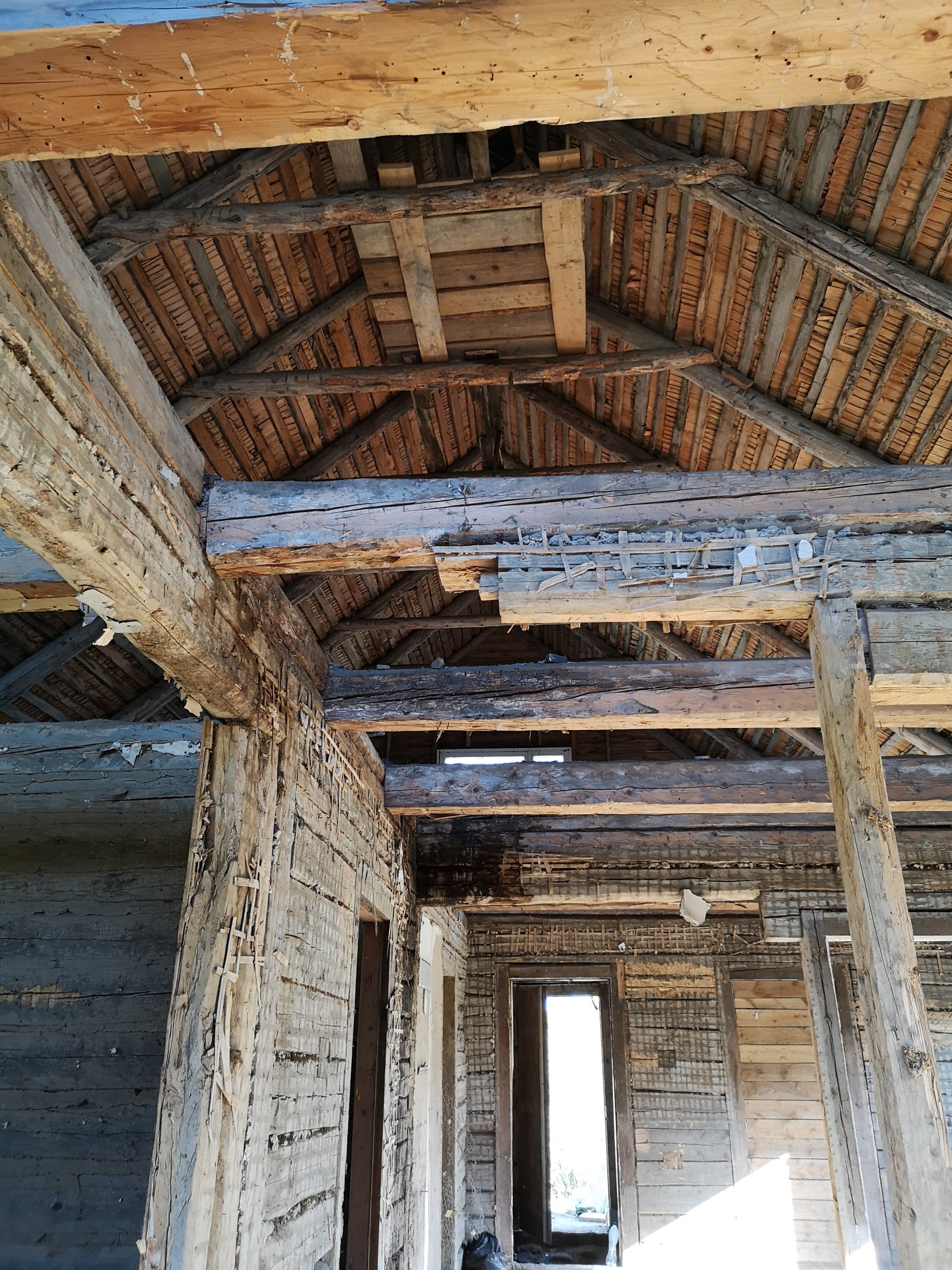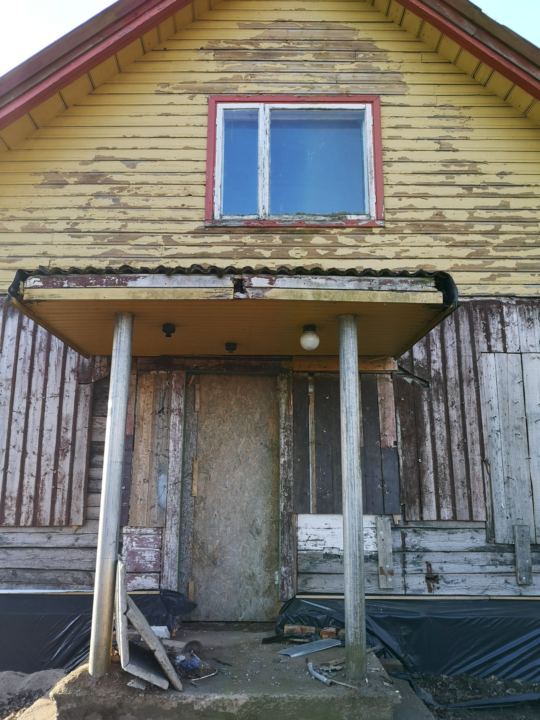 Vaja vahetada katuse eterniit. Selleks tuleks lammutada vana eterniitkatus, lisada uued lisasarikad ja olemasolevad pennid tõsta kõrgemale, tuuletõkkeplaadid, distantsliistud, aluskate ja roovitus, ääre ja harjaplekid. Uueks eterniidiks villa grafiit. Sarikaid tuleks natuke pikendada, sest vundament on laiem kui varem. Hoone põhiosa viilkatuse pind on 1520x720 cm x2 ning veranda viilkatuse pind 320x270 cm x2. Pehkinud tugipalkide otsad tuleks eemaldada ja paigata.
