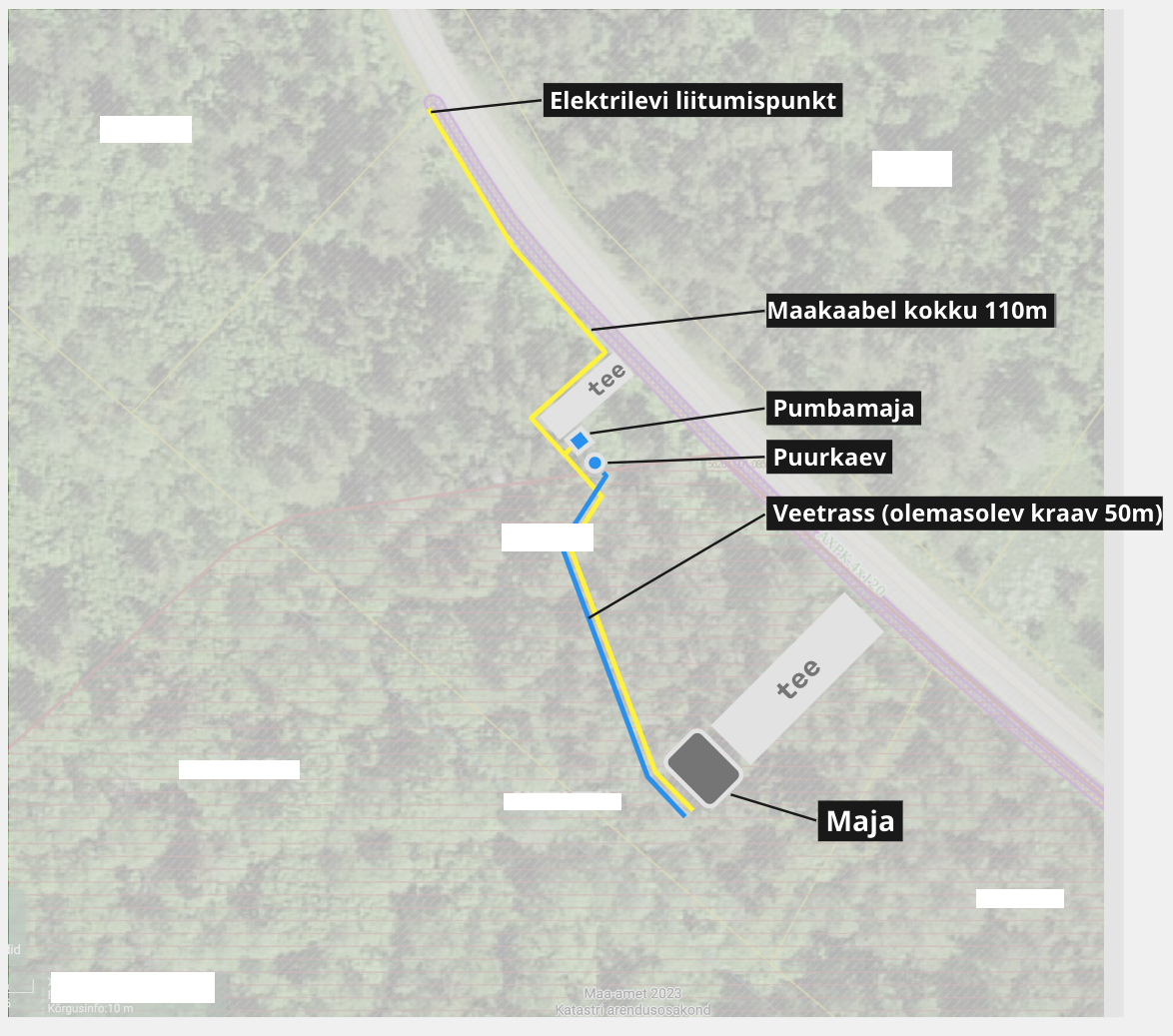 Liitumiskilbist on tarvis vedada maakaabel puurkaevu pumbamajani ning sealt edasi tuleva maja asukohani (maja valmib Augusti lõpuks). Pumbamaja on tarvis ühendada elektriga (hoiustab puurkaevu veeseadmeid).