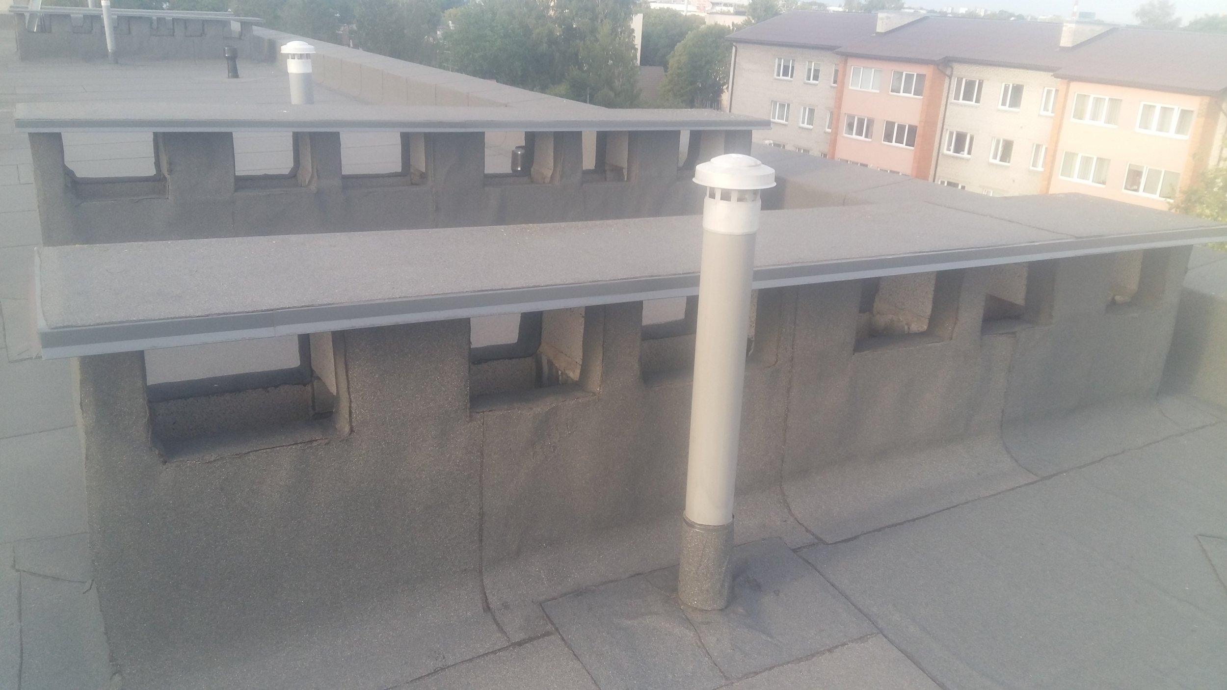 Iga korstna peale arvestatud kolm turbovent ventilaatorit )ehk siis kokku 45tk. )ühenduse läbimõõduga 315mm. Korstnas sees kanalite pikendamist ja ventkorstna külgede kinni ehitamine ja SBS rullmaterjaliga katmine.