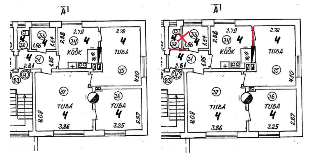 Korteris tehtud varasemalt renoveerimise käigus mõned muudatused. Wc ja sahvri vaheline kergsein eemaldatud ning kahe ukse asemele jäetud üks uks. Samuti kinni ehitatud köögi ja toa vaheline uks. Info pildil. Sooviks pakkumist möödistusprojektile nende muudatuste kajastamiseks registris.