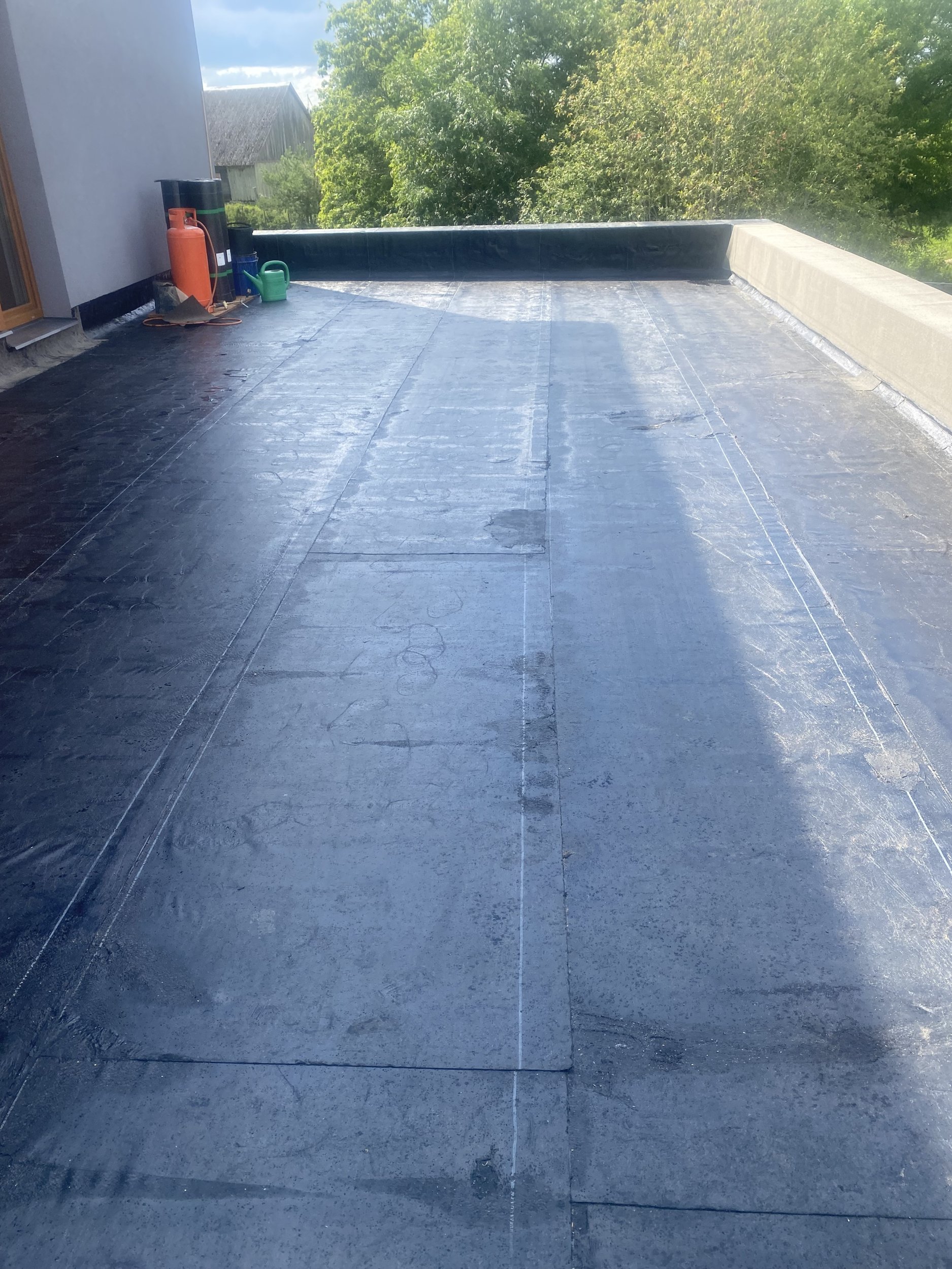 Esimene kiht ruberoidi keevitatud, DEPO toode. Jäid mingid mullid alla ja mõned pealekatte ääred kahtlased. Tundub, kas liiga palju või vähe kuumutatud.