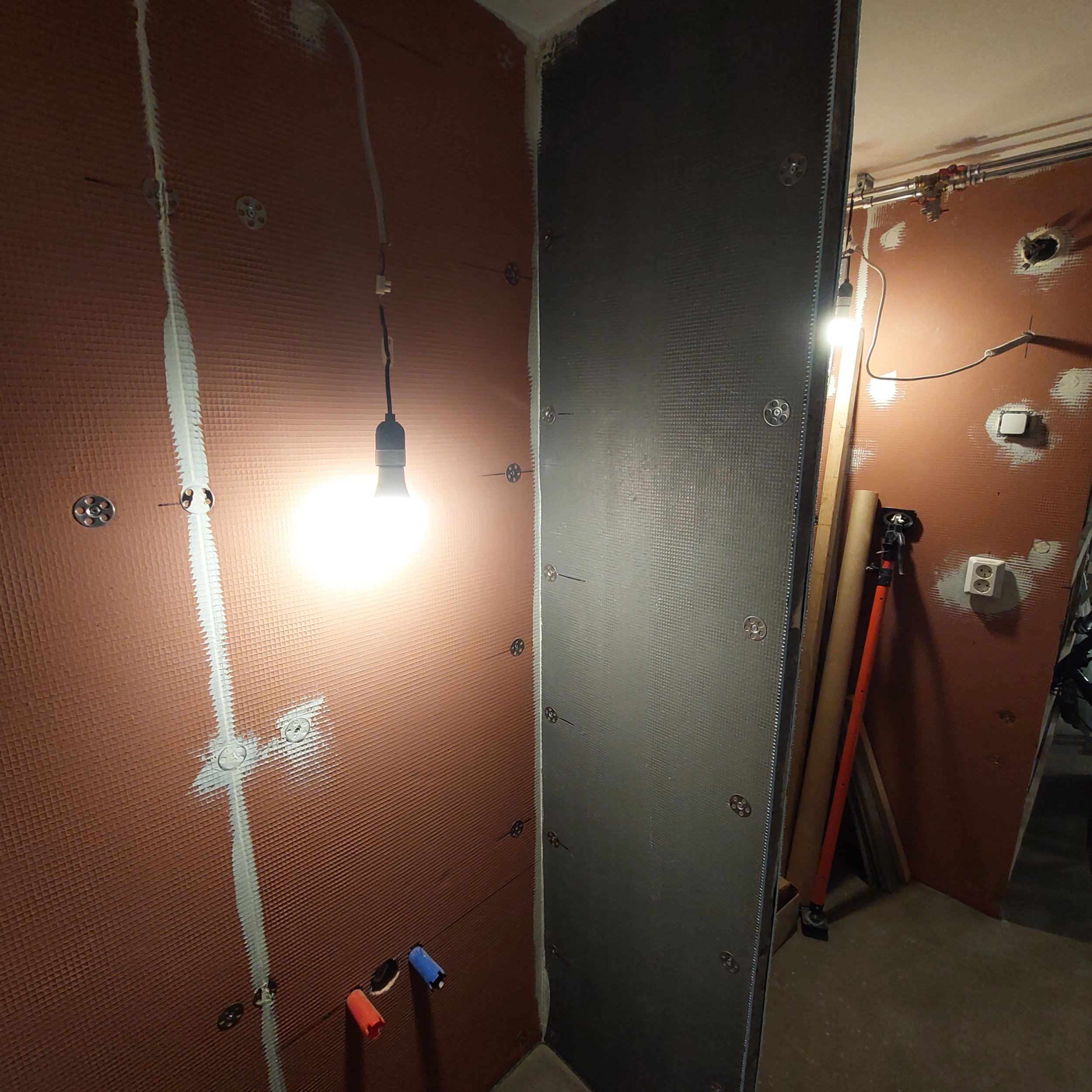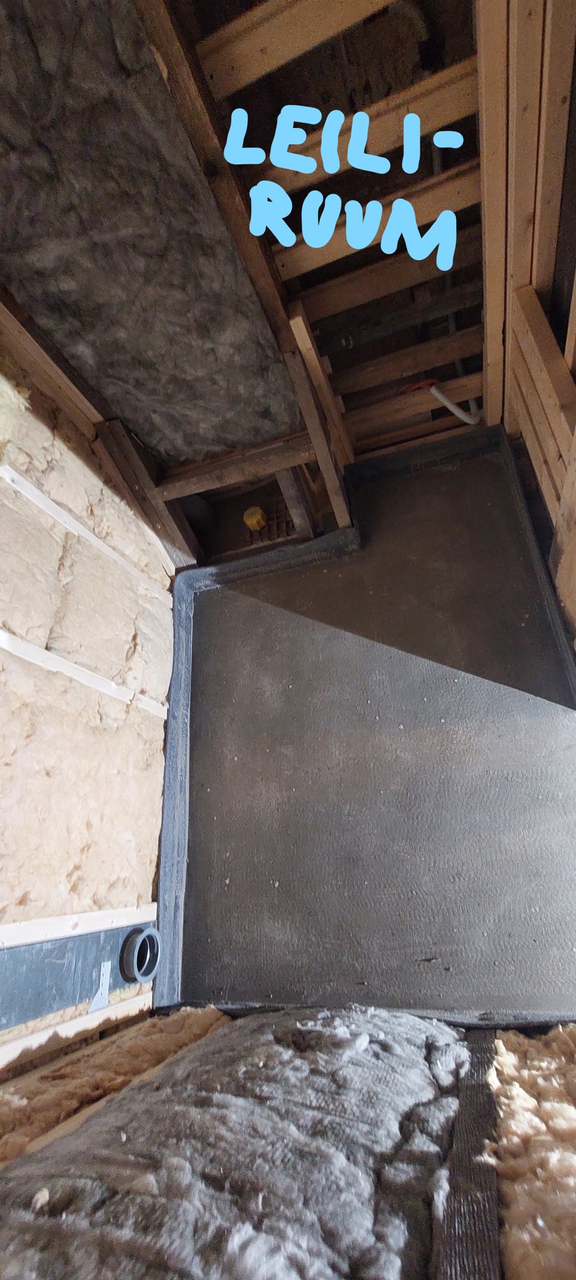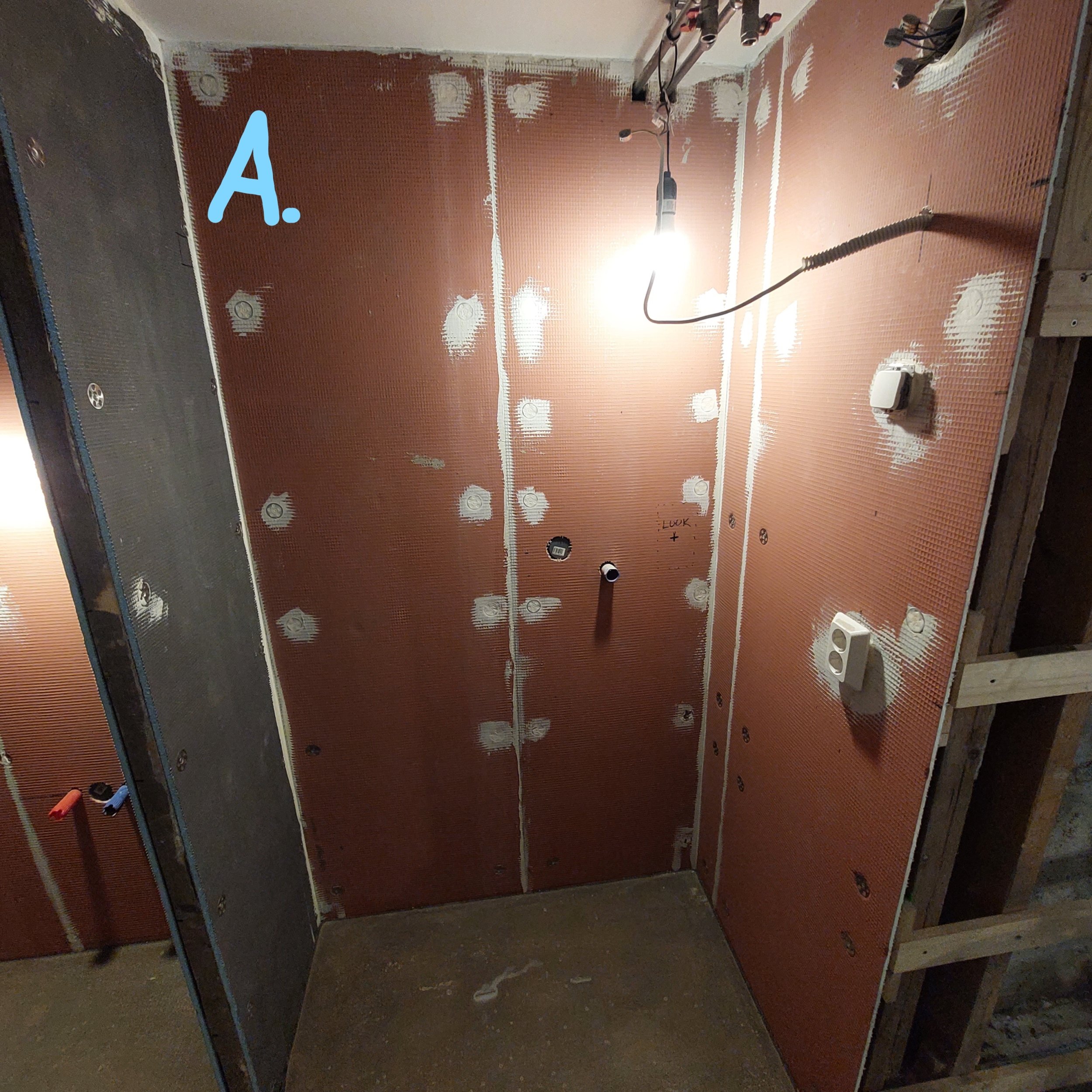 Leiliruumi ja duširuumi plaatimine 5x5cm võrgul plaatidega, leiliruumis ka 10cm kõrgune ääris samadest plaatidest. Nendes ruumides on kalded olemas. Duširuumi Tycroc plaatidest seinte plaatimine 30x60cm plaatidega. WC seinte plaatimine 20x25cm plaatidega. Suure ruumi põranda, WC põranda ja pildil märkega A seinte plaatimine 60x60cm plaatidega. Suure ruumi äärtele vaja 60x60cm plaatidest lõigata ja paigaldada 8cm kõrgused äärised. Kokku plaatida umbes 45m2.