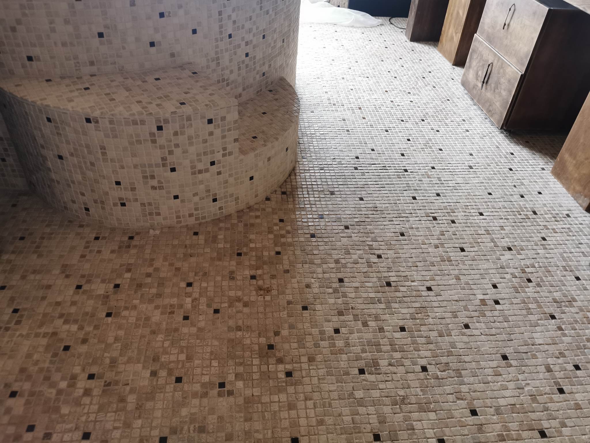 Kogu vannituba, ümar suur vann ja poolringi kujuline dushinurk on plaaditud sama kivimosaiigiga.