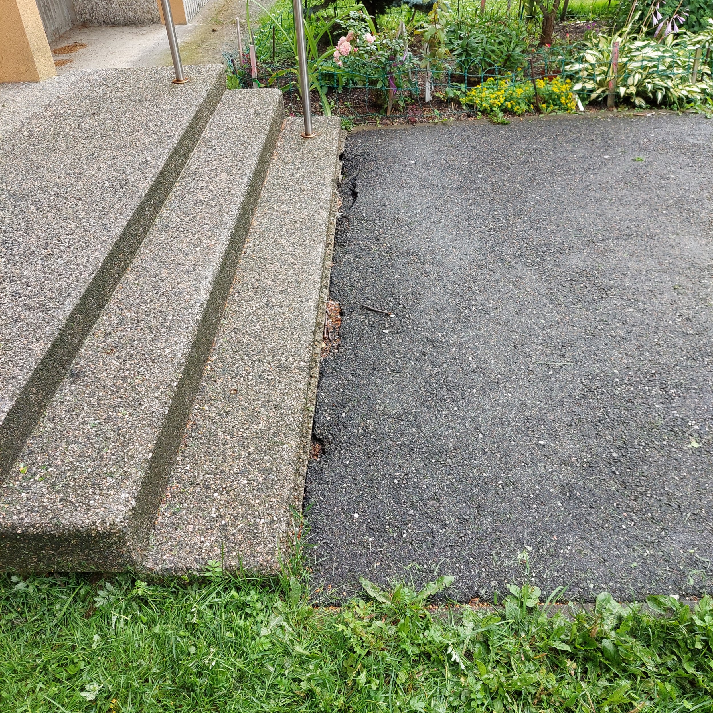 Lõigata ära ja utiliseerida maja 1. ja 4. trepikoja trepi esine vajunud asfaltkate koos äärekiviga (kumbki 3m x 0,4m). Teha killustikalus (vajadusel eemaldada pinnast) ja tihendada. Valada betoonist uus teekate, kasutades sobivat armatuurvõrku (teras või fiiber, silmaga 10x10 sm).