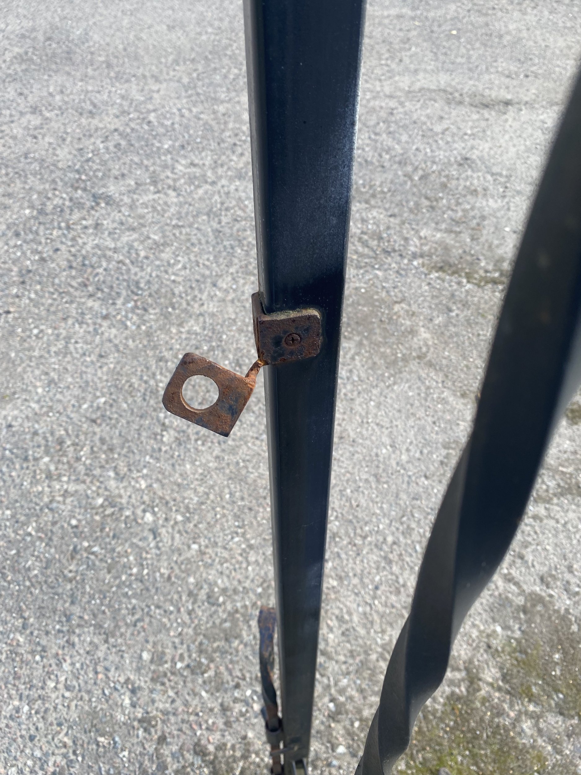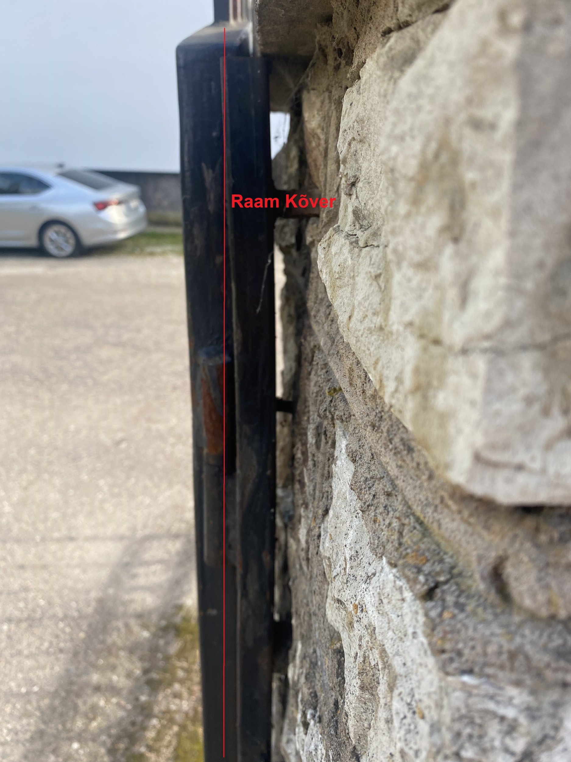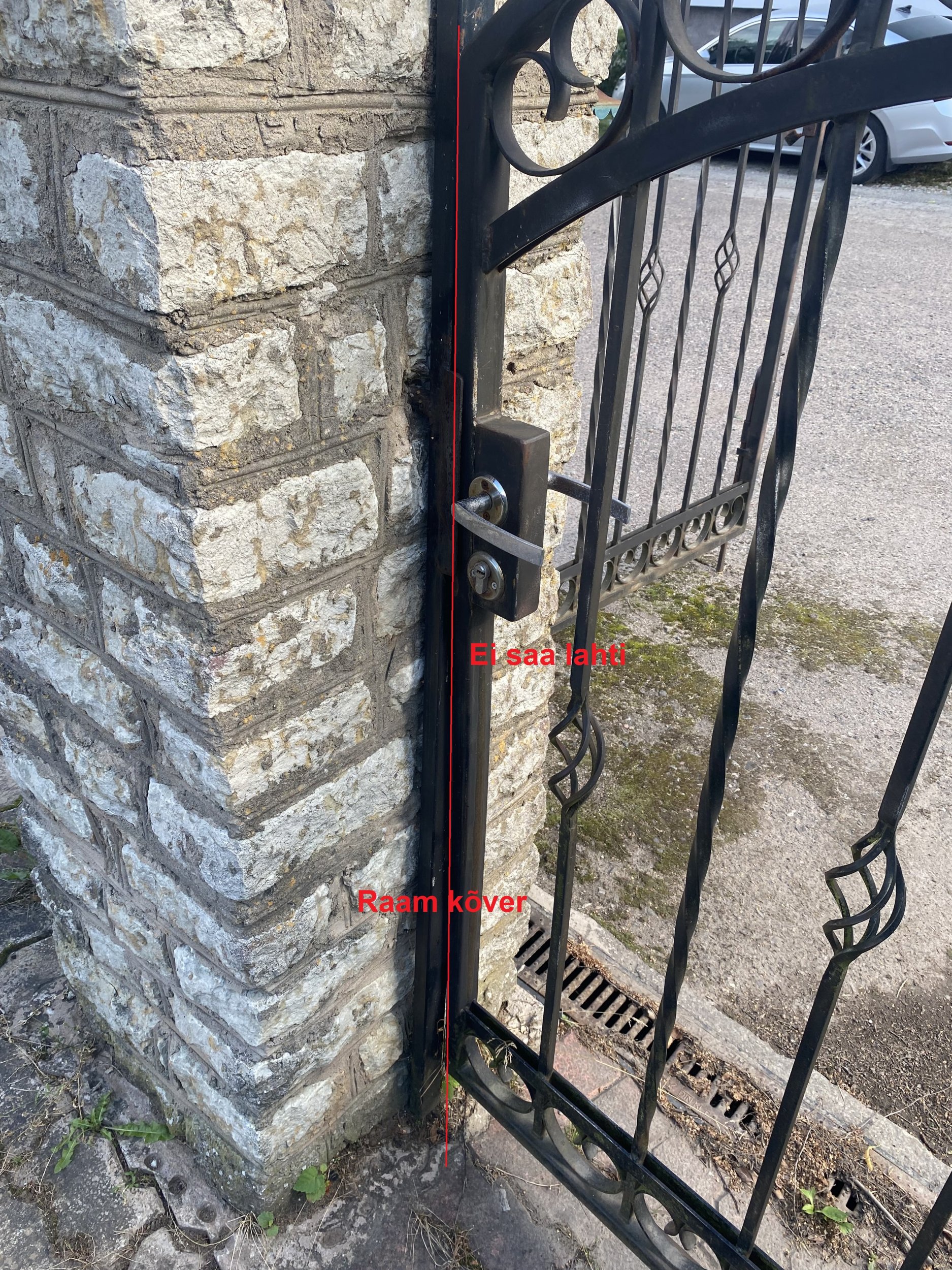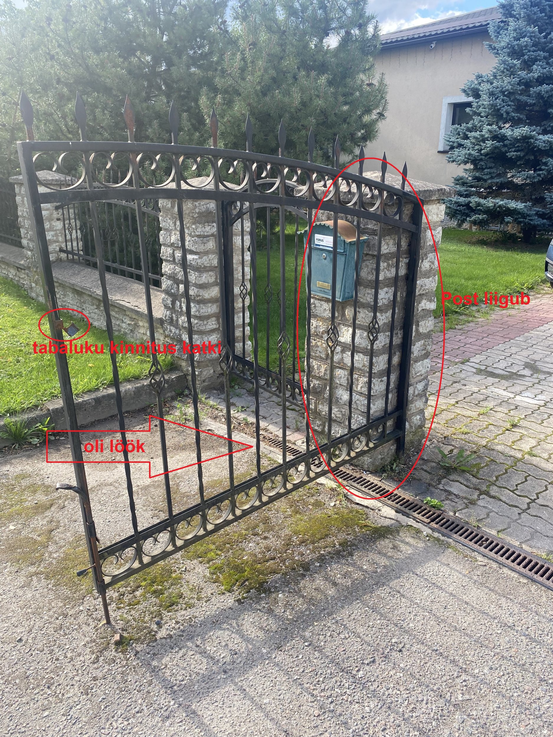 Liiklusõnnetus, suur auto tagurdas vastu värava ja posti. Varava raam/alus on kõver (metall), jalgvarav ei saa lahti, kõver. Aiapost (kivist) liigub, müts ka. Tabaluku kinnitus katki. Varav saab lahti teha, liigub aga hinged vist on vigastatud, kõverad.