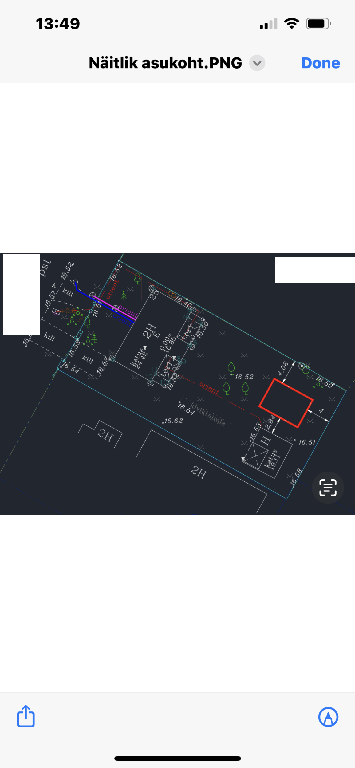 Oleks vaja kanalisatsiooniprojekti. Muugal tagaaeda vaja paigaldada aiamaja seega vaja vedada kanal ja vesi tänavapoolsest liitumiskohast. Krundi suurus 800m2. Punasega on märgitud aiamaja asukoht ja joonisel on ka olemasolev kanal suure majani.