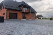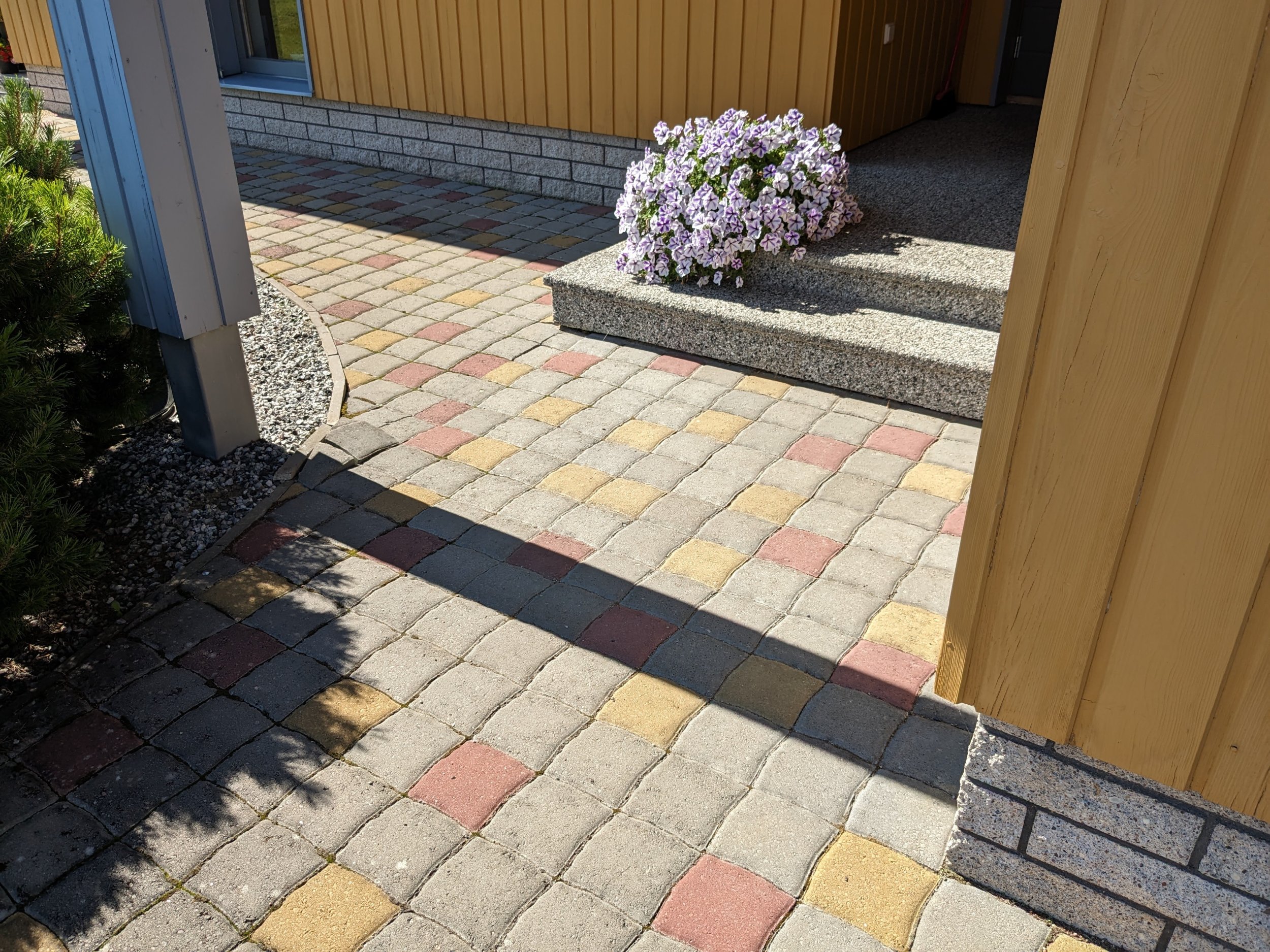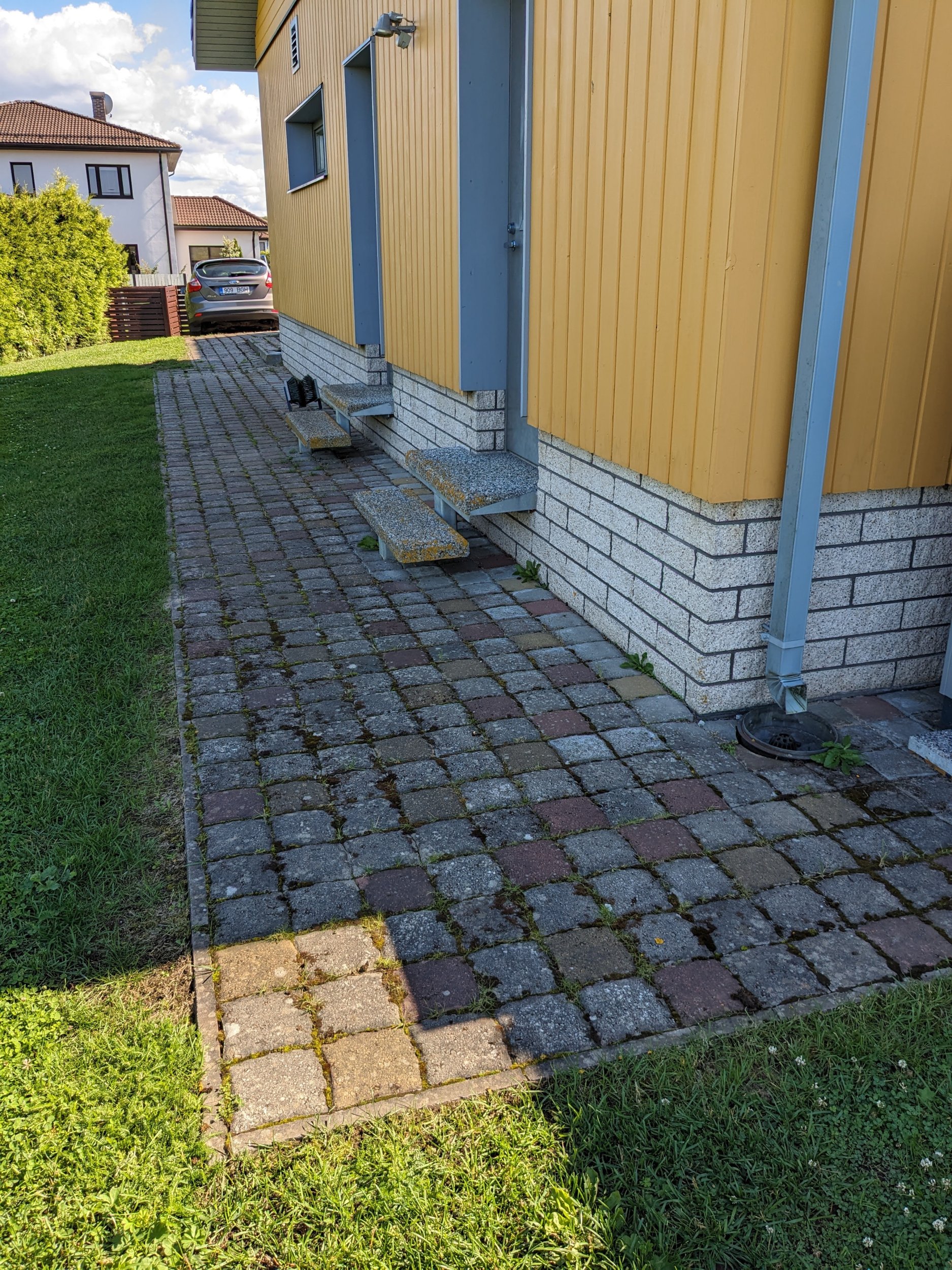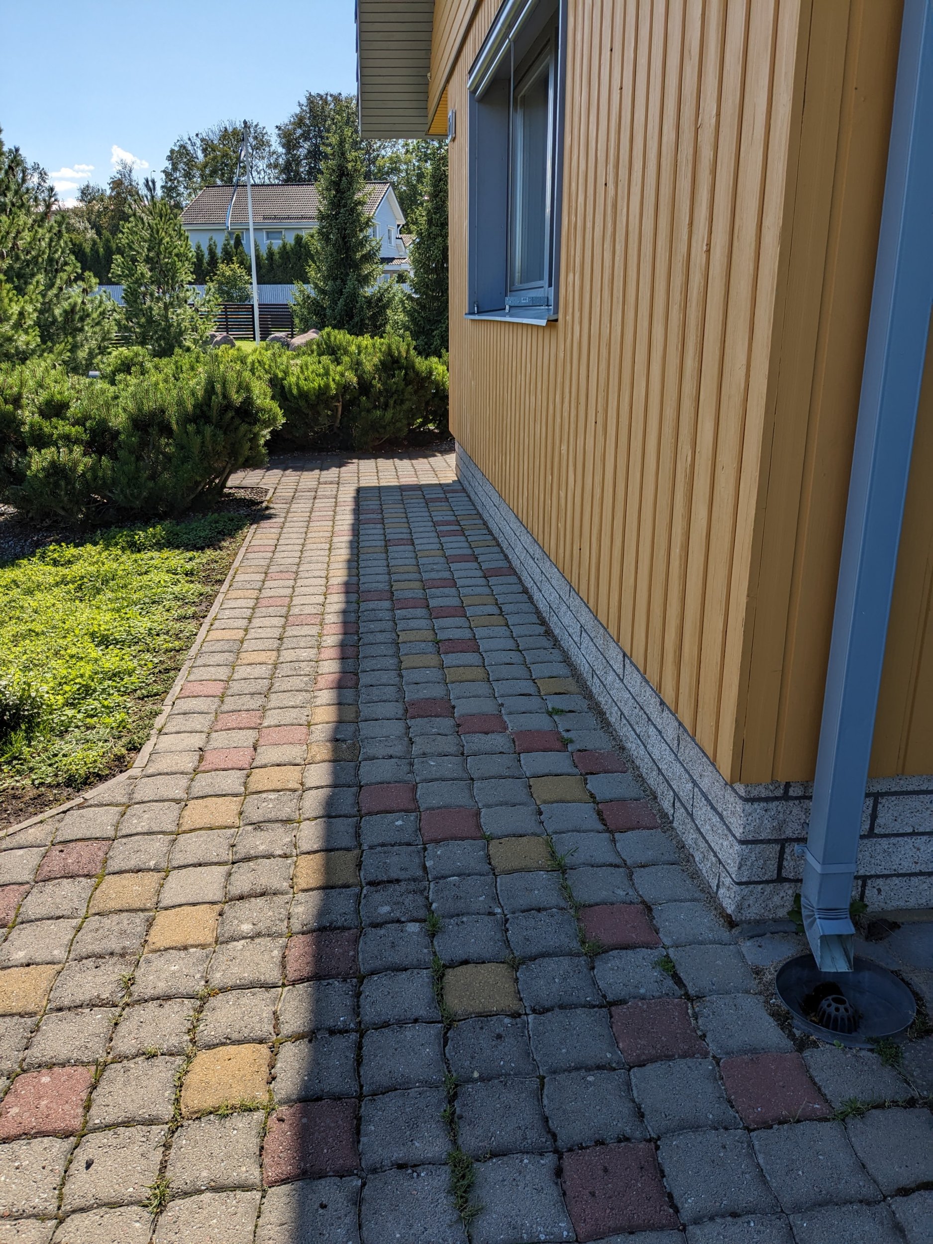 Graniitklotse, mustad 10x10x5 cm, plaan paigaldada äärekivi kõrvale pea kogu selle pikkuses. Maja ees U kujuliselt kaks kõrvuti, mujal üks. Arvutamise järgi ca 1100 klotsi e. 11 m2 (sama palju jääb tänavakivi üle).