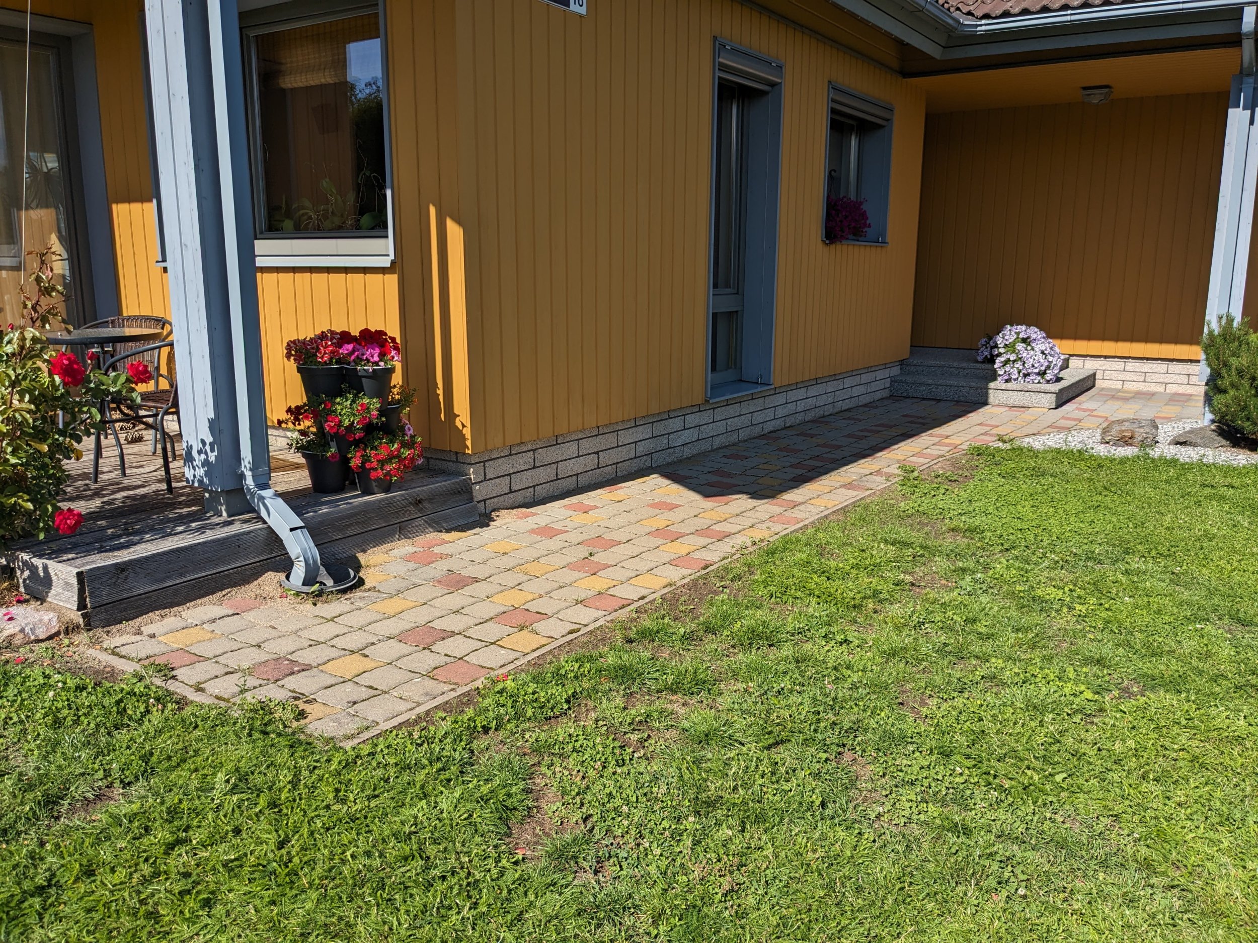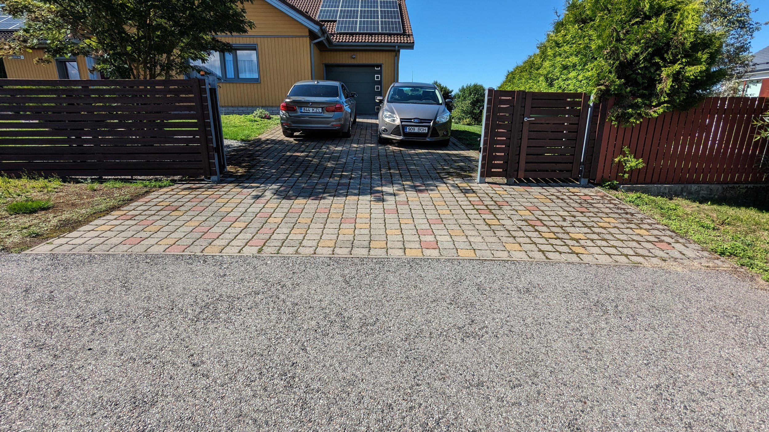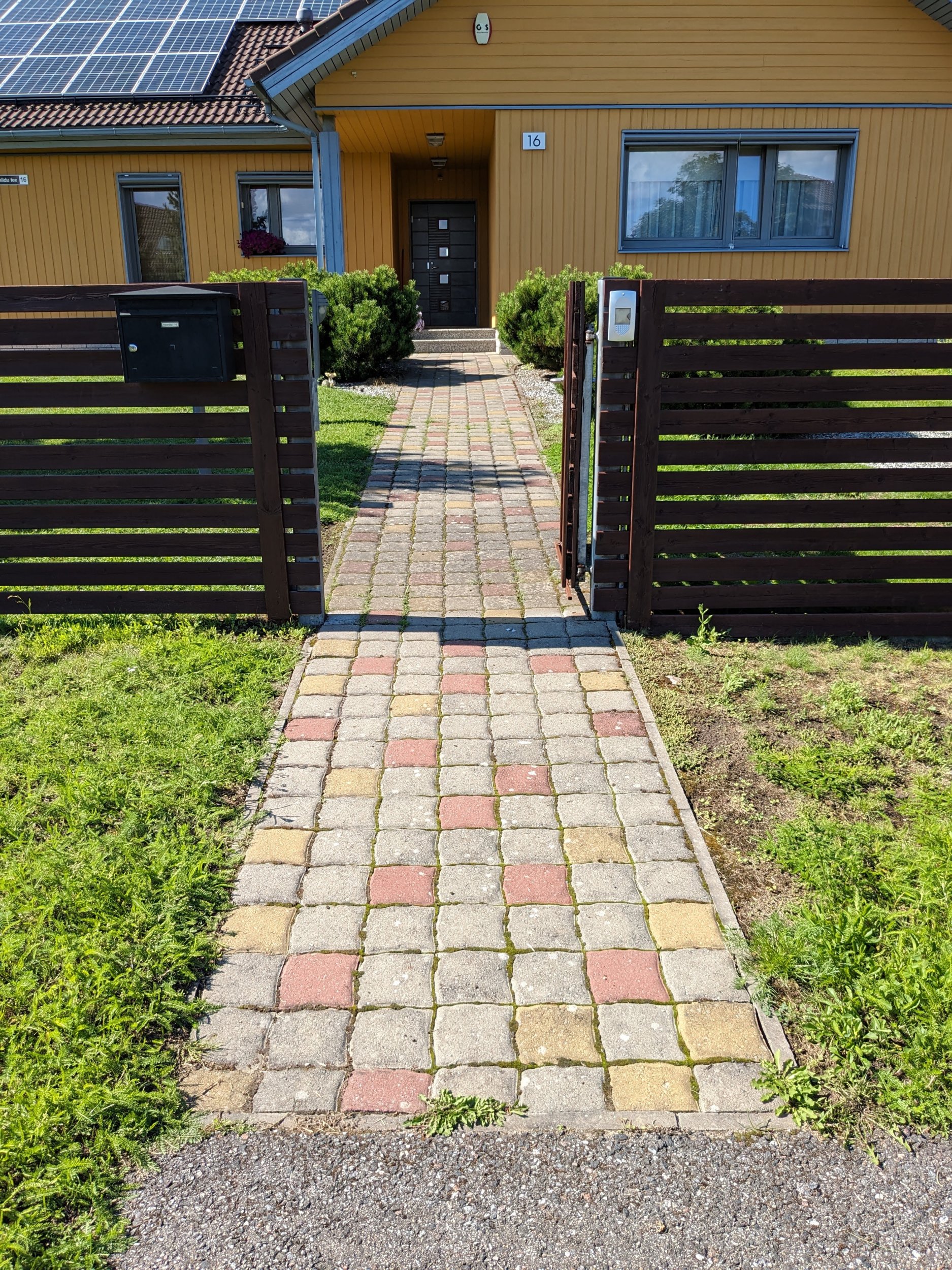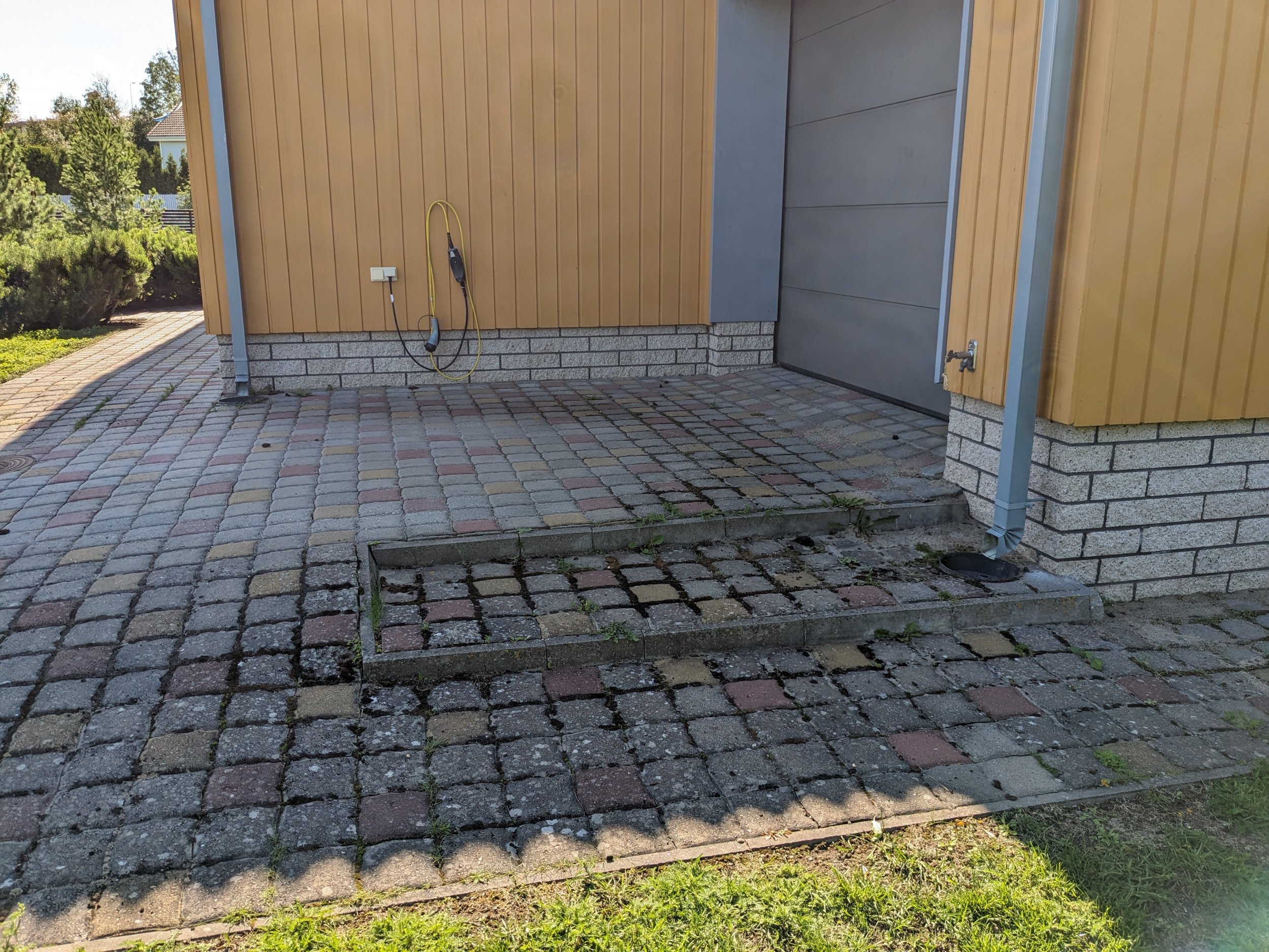 Graniitklotse, mustad 10x10x5 cm, plaan paigaldada äärekivi kõrvale pea kogu selle pikkuses. Maja ees U kujuliselt kaks kõrvuti, mujal üks. Arvutamise järgi ca 1100 klotsi e. 11 m2 (sama palju jääb tänavakivi üle).