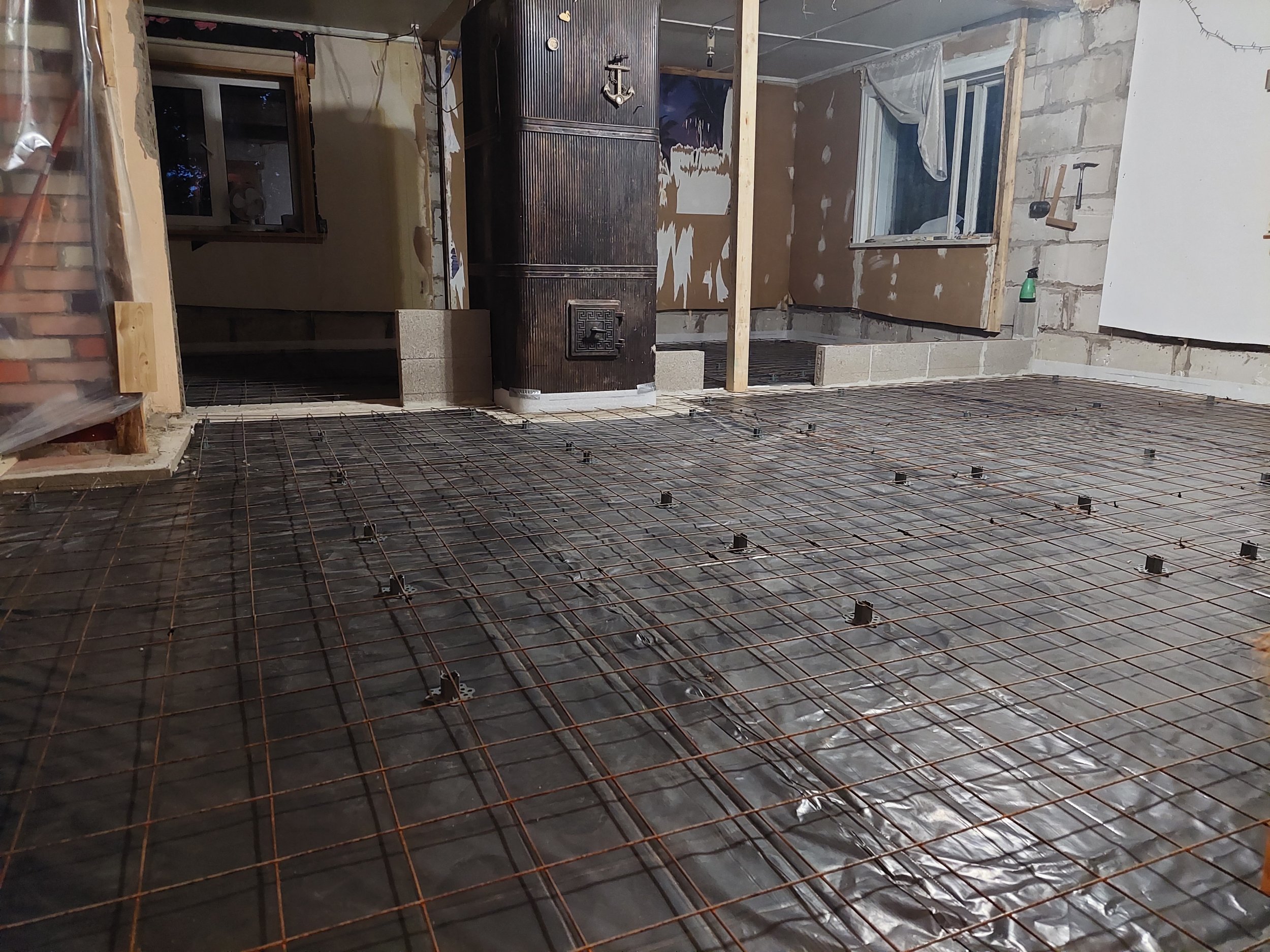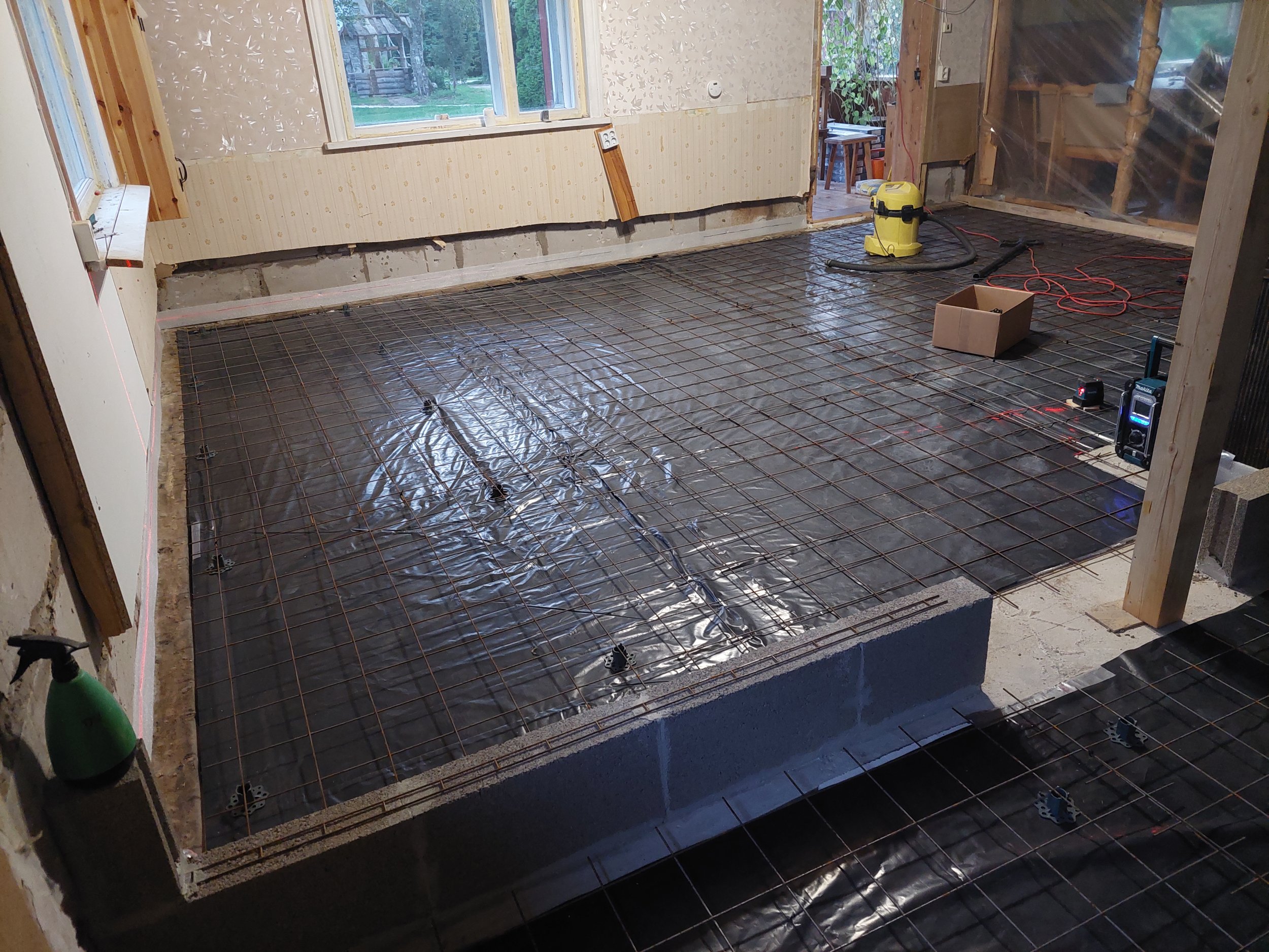 Ettevalmistustööd kuni kileni, armatuurini koos kanduritega on tehtud, betoneerimiseks vajalikud lisapiirded on paigas ning üldiselt on mööda seinu ka paika joonitud orientiirid laseri abil, et lihtsustada siis betooni valamist (kui selline asi abiks on muidugi). Üks elumaja, suurem pind on ühes ühikus, kuigi osaliselt poolitatud uute vaheseintega, eraldi on maja teises osas pisem pind veel. Pindalad vastavalt 52,2m2 ja 12,65m2, soovitud betooni paksuseks on 7 cm. Betooniautoga pääseb maja ette parkimisalasse, 20 meetrit majast, antud ala kannatab kindlasti kogu auto raskust (testitud 15 tonni killustiku toonud kalluriga). Vajalik on tegija poolt meeskond, kes valaks, tasandaks betooni ning kuna kogu pind läheb hiljem parketi alla, siis (ilmselt?) ka betoneerimisjärgset lihvi.