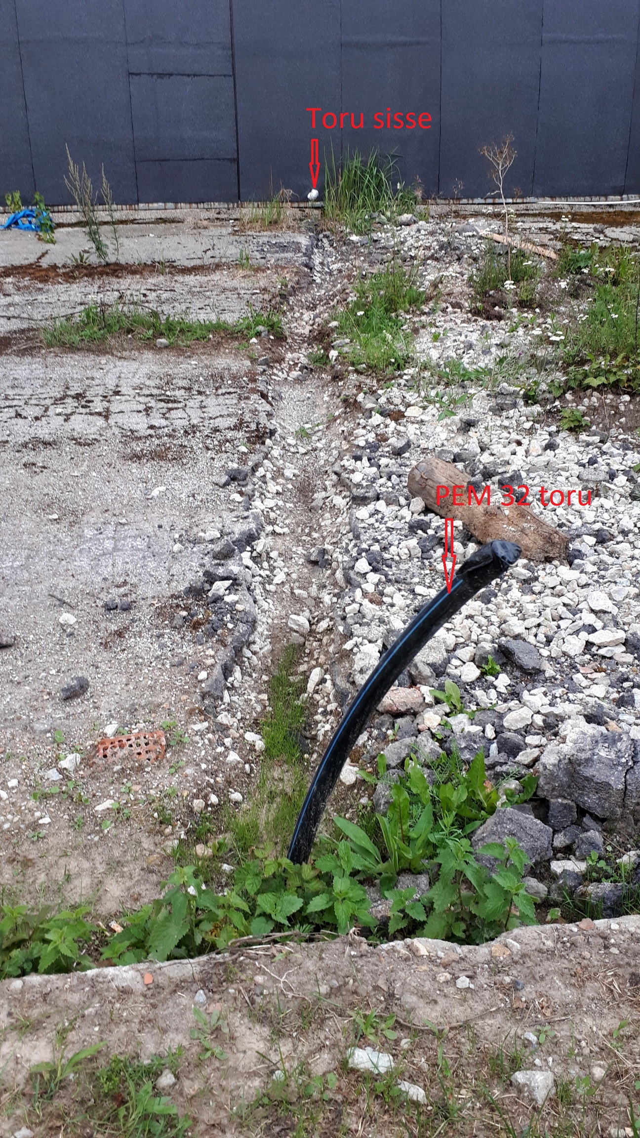 Liitumispunktis majja toru PEM 32, sisse küttekaabel. Pikkus 8 meetrit. Toru tuleb ca 20-30 cm sügavusele. Majja sisenemine on ca 10 cm kõrgusel maapinnast. Võibolla oleks mõistlik veetoru isoleerida; seda võiks teostaja sõnumis pakkuda.