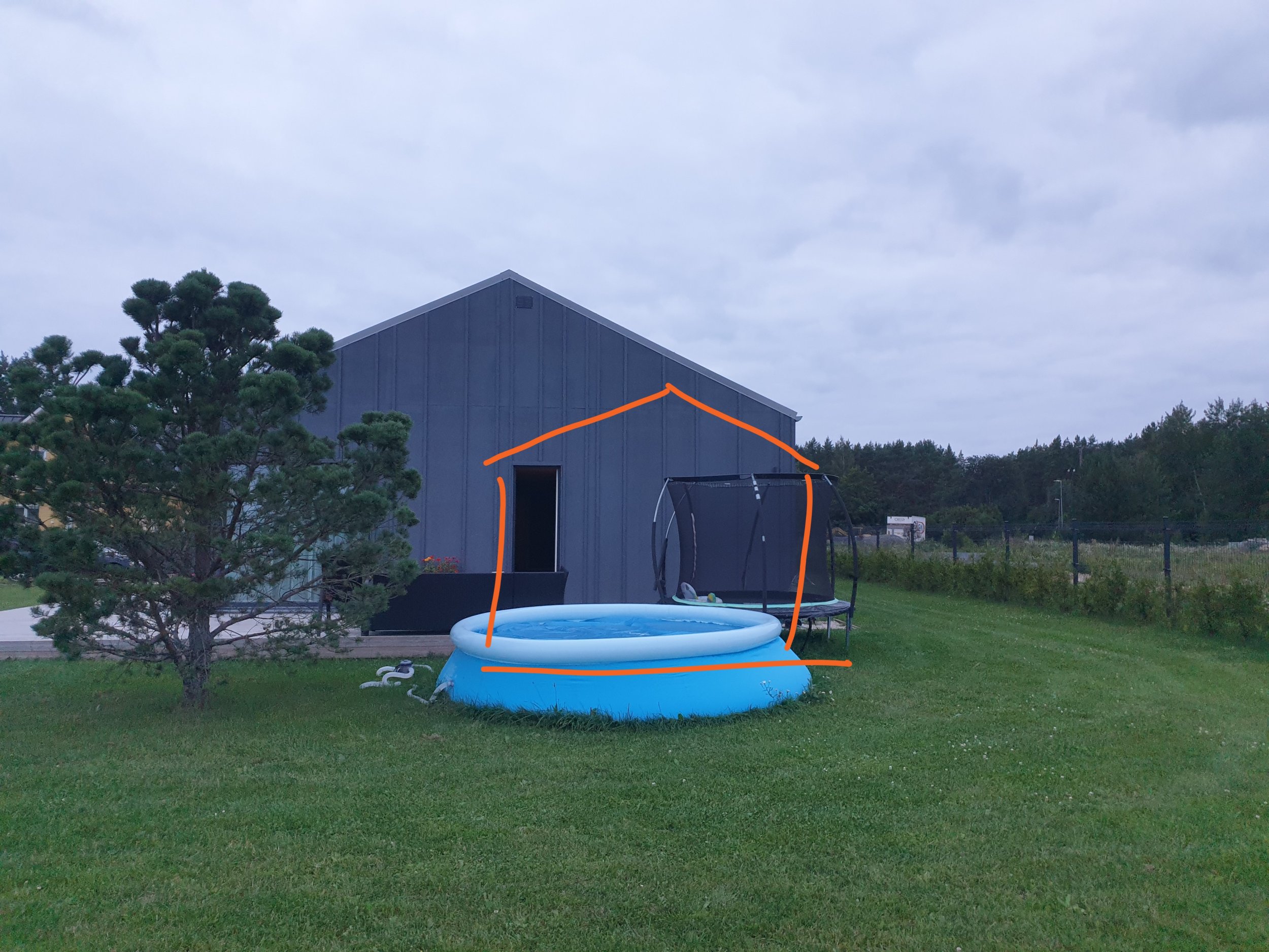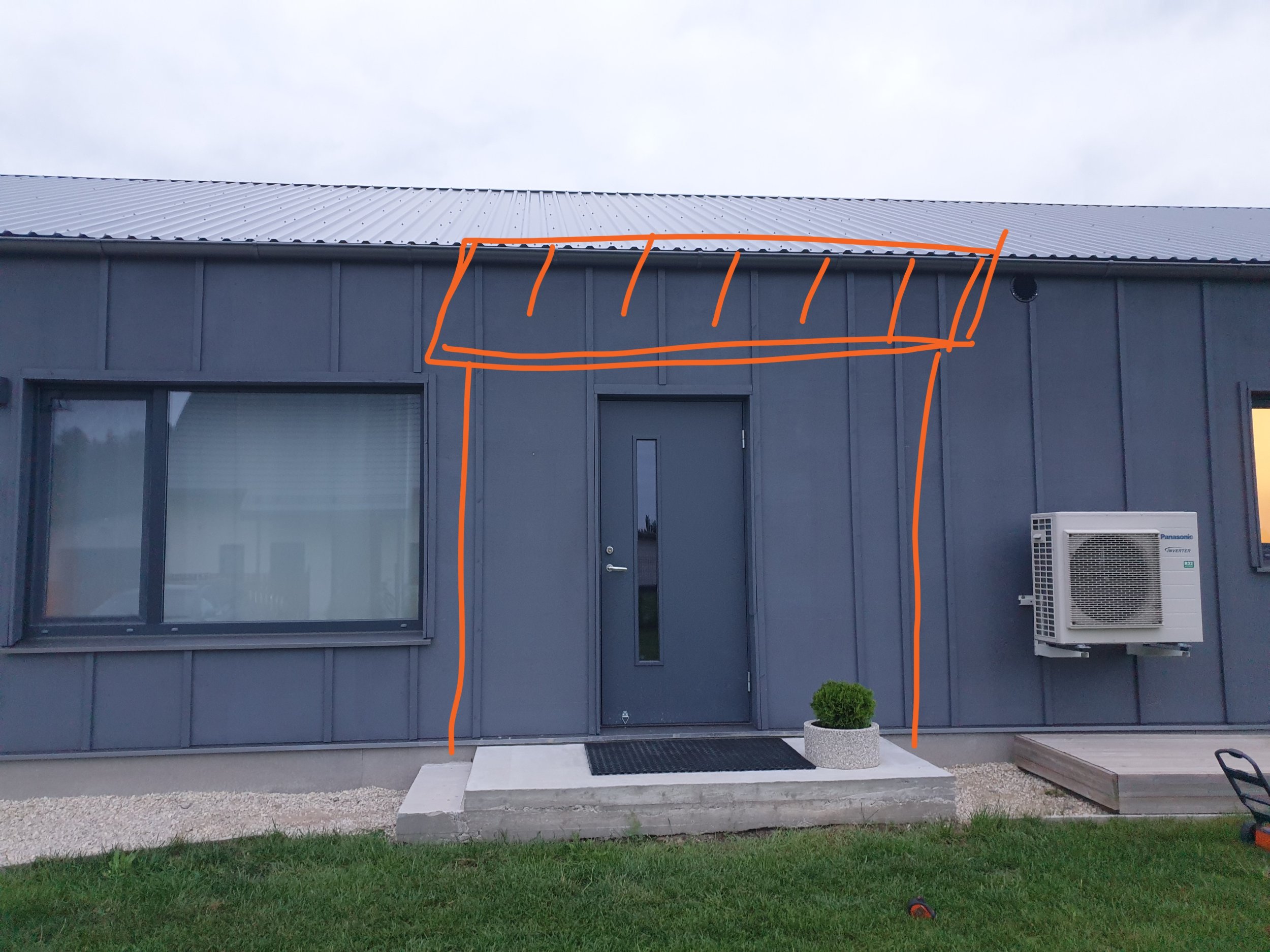 Ukse ette vaja ehitada betoonaluse peale varjualune, umbes 3m2, jätkates majakatuse langust, 2 posti ja katus.