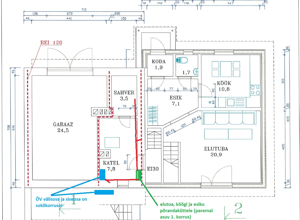 1k . plaanilt on näha, kus asub pump ja praegune kollektor. Ruum asub soklikorrusel ja on kõrge laega. Punasega on näha, kuidas on praegused kütte torud ja kust lähevad üles. 2k plaanilt on näha ruumid ise (punasega) ja teiselt plaanilt kus asuvad hetkel radikad ning kust liiguvad torud hetkel.