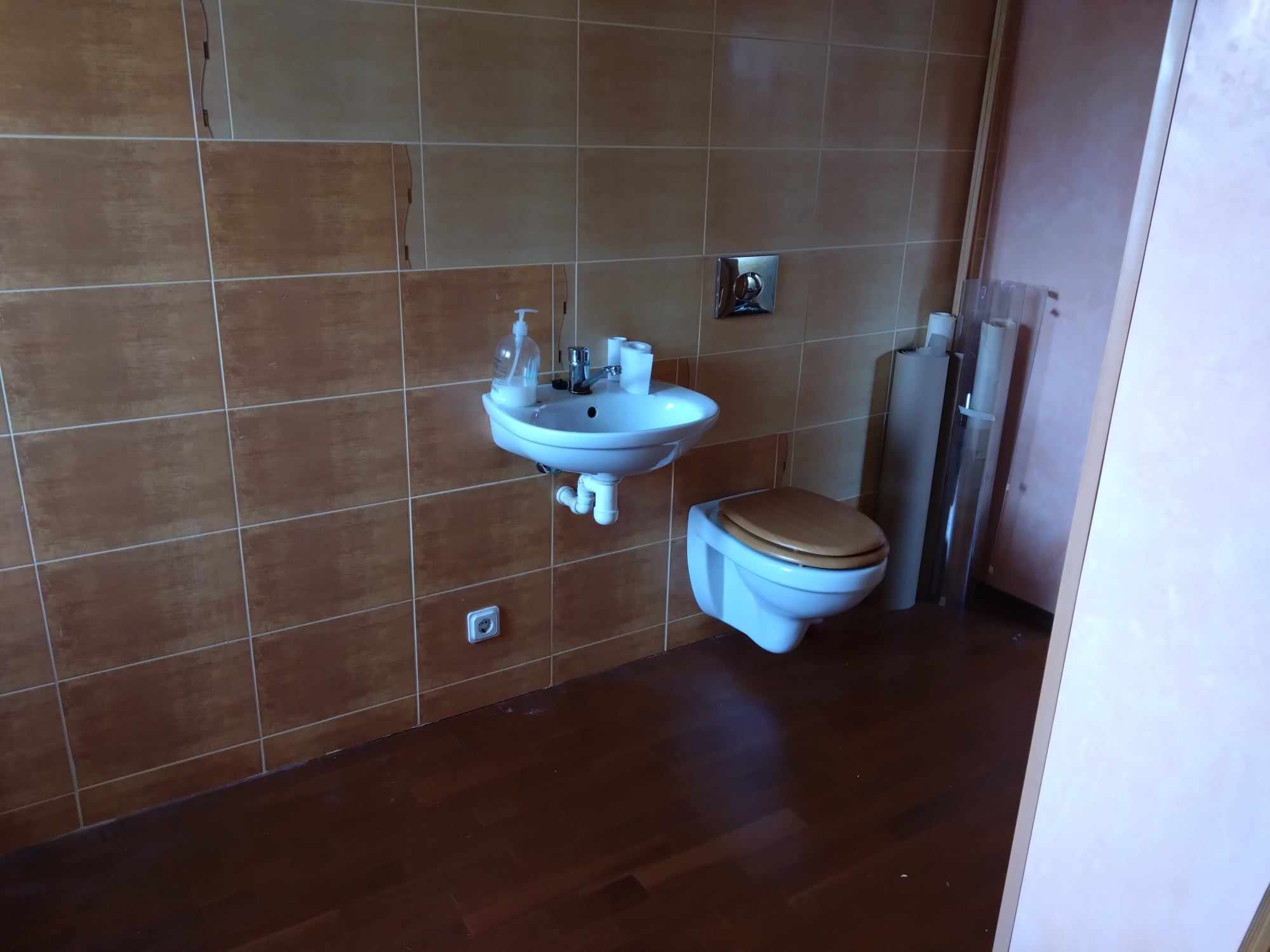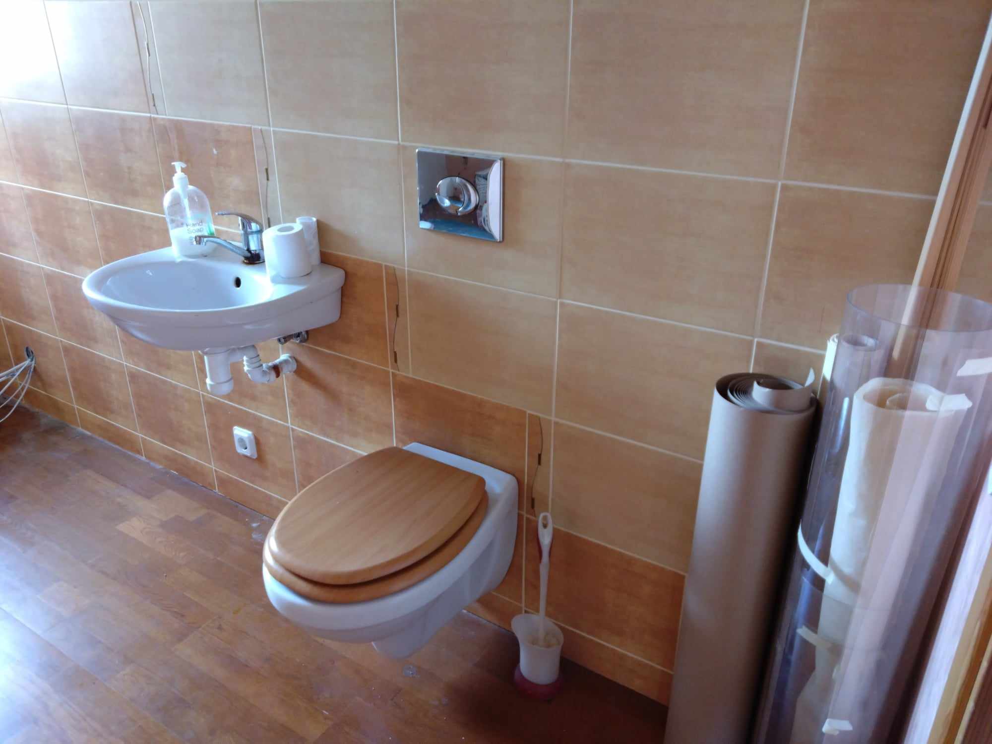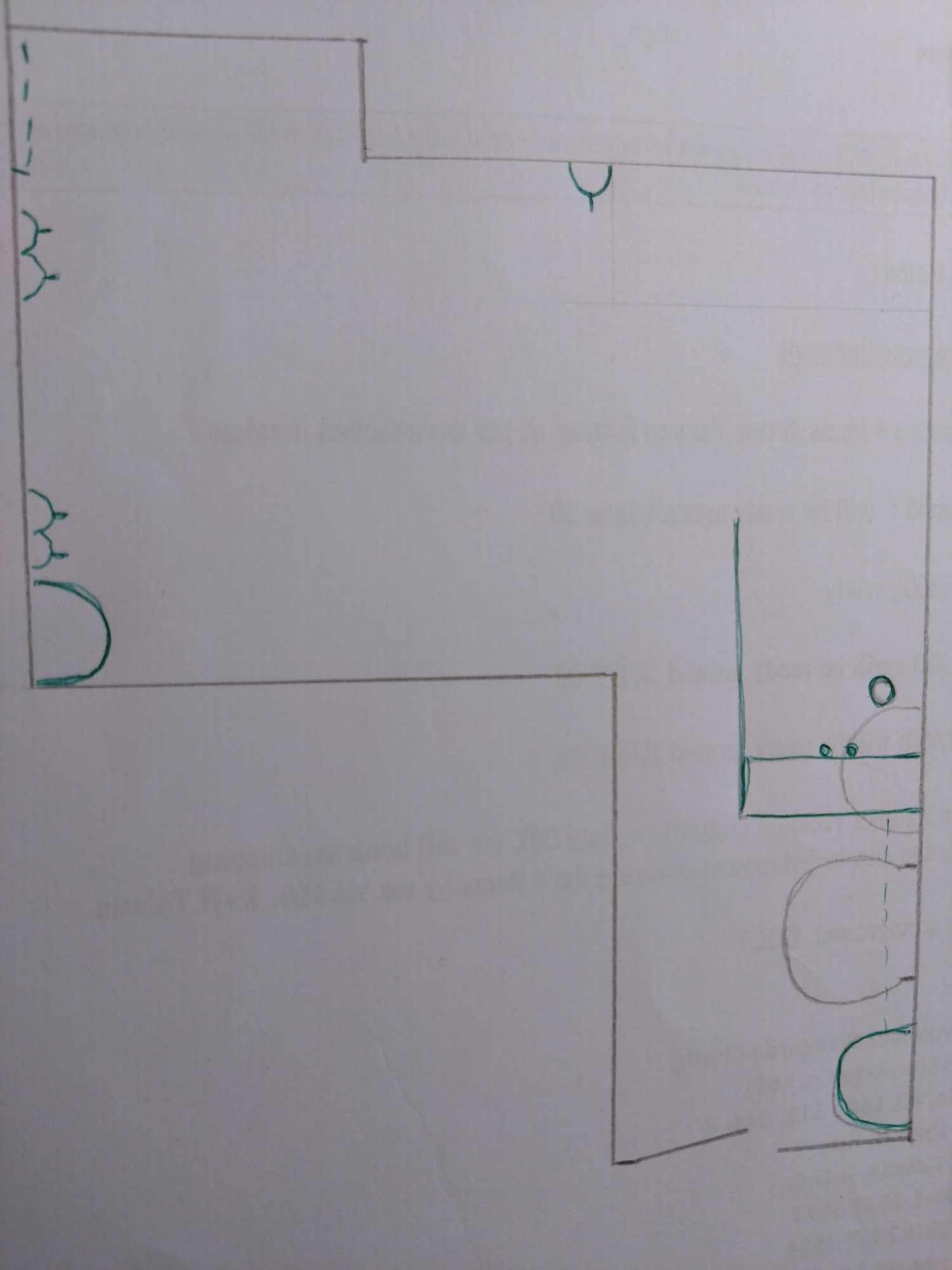 Lisatud pildil on näha rohelisega märgitud uued asjad. Olemasolev kraanikauss peaks liikuma WC potist paremale. Torud saab vedada olemasolevatest pinnapealselt poti alt. Praeguse kraanikausi kohale ehitada sein u 80 cm lai, plaatida ja paigaldada dušši segisti. Paigaldada ka duššalus. Põrandasse saab teha augu ning liita äravool esimesel korrusel lae all jooksva äravoolutoruga. Vastasnurgas olev kahjustunud kipsplaat vastava suurusega asendada. Samale seinale tuleb kraanikauss - torustik on seal olemas, vajalik ainutl ühendus. Lisaks paigaldada mõned uued pistikupesad.
