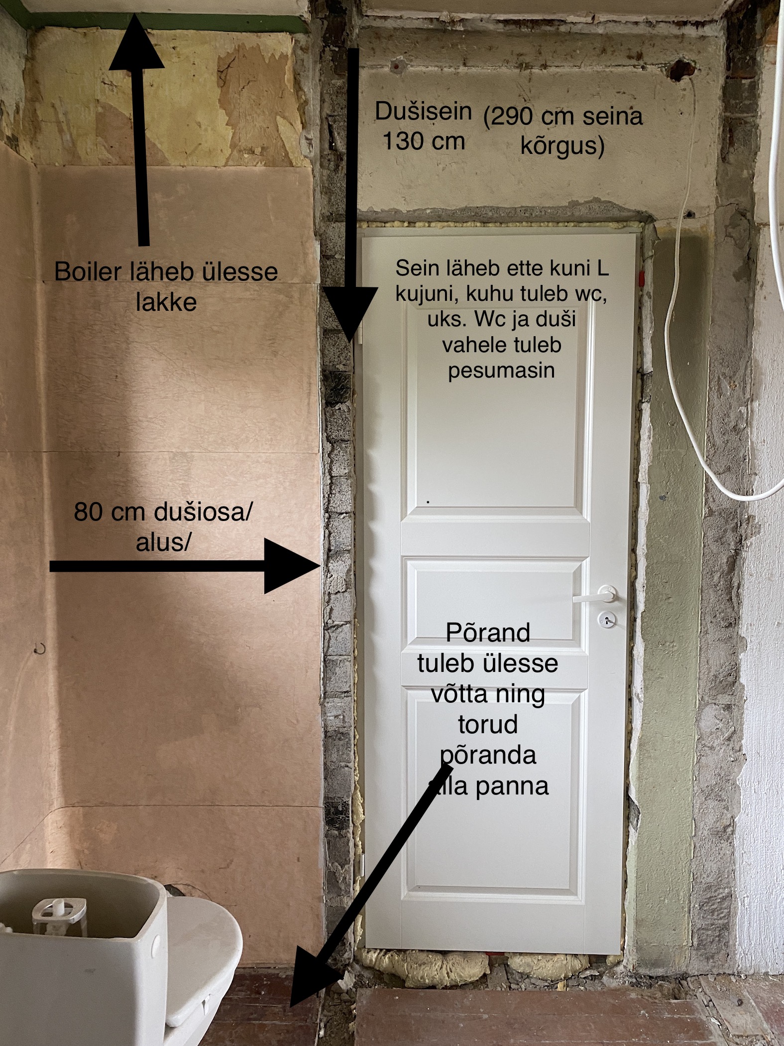 Vannituba tuleks L-kujuline. Dušialus 80x80 cm ja WC poti asemele (vaata pilti), seejärel pesumasin ning wc pott). Põranda pindala circa 4 ruutu. Seina kõrgus 290 cm ehk siis seina ja laepinda vannitoas oleks circa 20 ruutu.