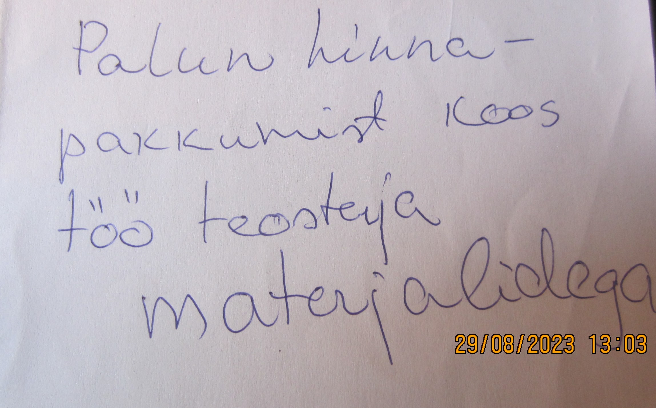 Pakkumises kivi profiilplekk. Kui materjalid minupoolt siis hind 7200.- koos km. Lugupidamisega. |