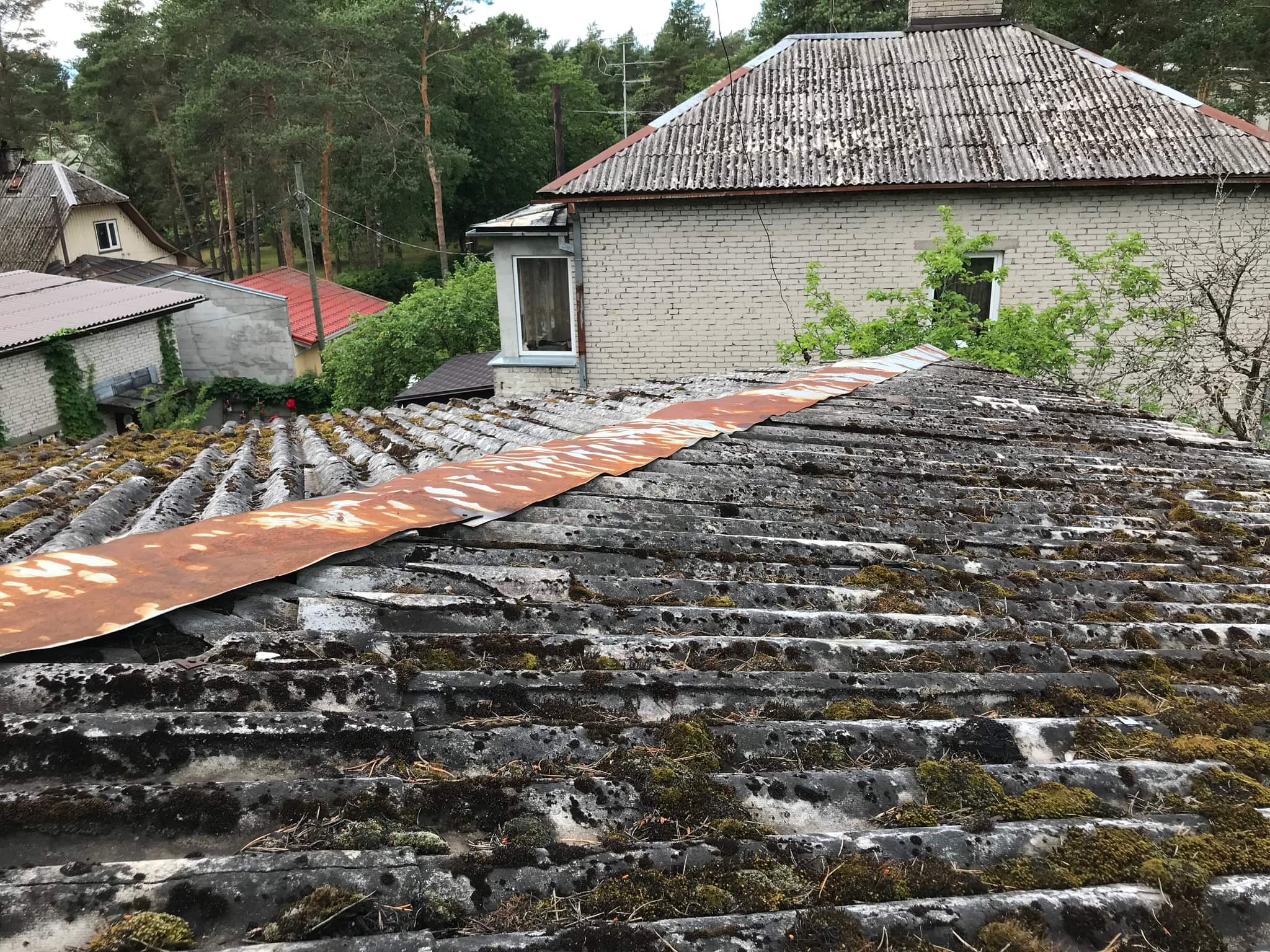 Vana eterniidi eemaldus ja utiliseerimine.Filterkanga paigaldus,Eterniidi all tõrvapappkatus.Asendamine siis kas pvc Proton või plekkkivi profiiliga.Palun mõlemale hinnapakkumist.Pind 126 m2,kolmnurkprofiil igast küljest.