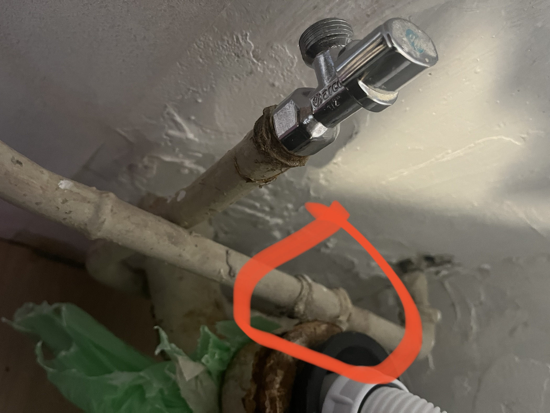 Köögi veetoru lekib liite kohapealt(esimesel pildil punasega märgitud).Liidet ise lahti keerata ei jõua(aastakümneid vana). Oleks vaja see lekkiv osa torust eemaldada ja survevooliku liitmik kinnitada sinna otsa(teisel pildil punasega märgitud koht). Survevoolik on endal olemas.