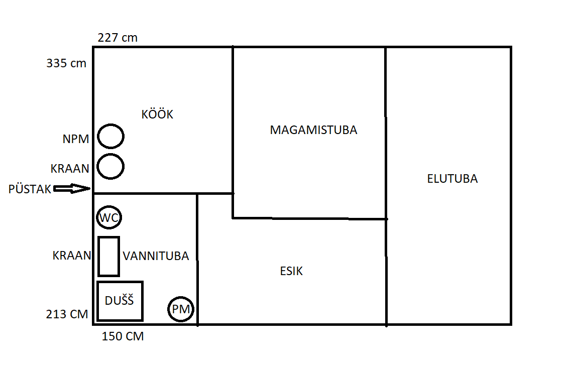 Vannitoa mõõdud 213*150 cm ; köök 335*227 cm