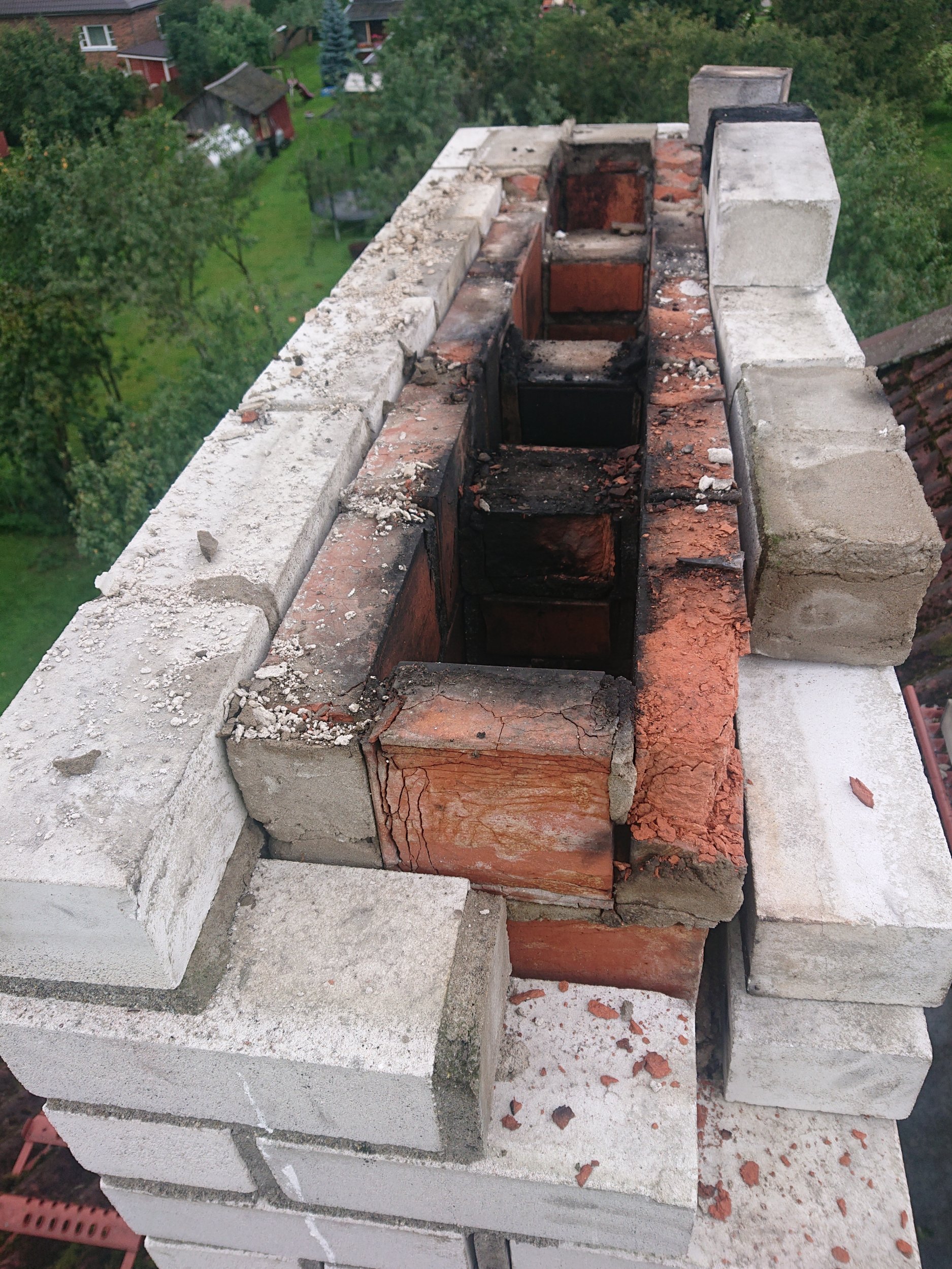 Lagunenud korstnapitsi lammutamine ja uue ladumine. 2 poole kivi lõõri ja 2 täiskivi lõõri, kõrgus 22-23 silikaadi rida. Ühekordne, mitte topeltsein nagu praegu. Korstnale müts ja veetõkke krae katusele. Katuse kalle 45 kraadi. Kogu korsten asub ühel pool katuseharja (ei läbi harja).
