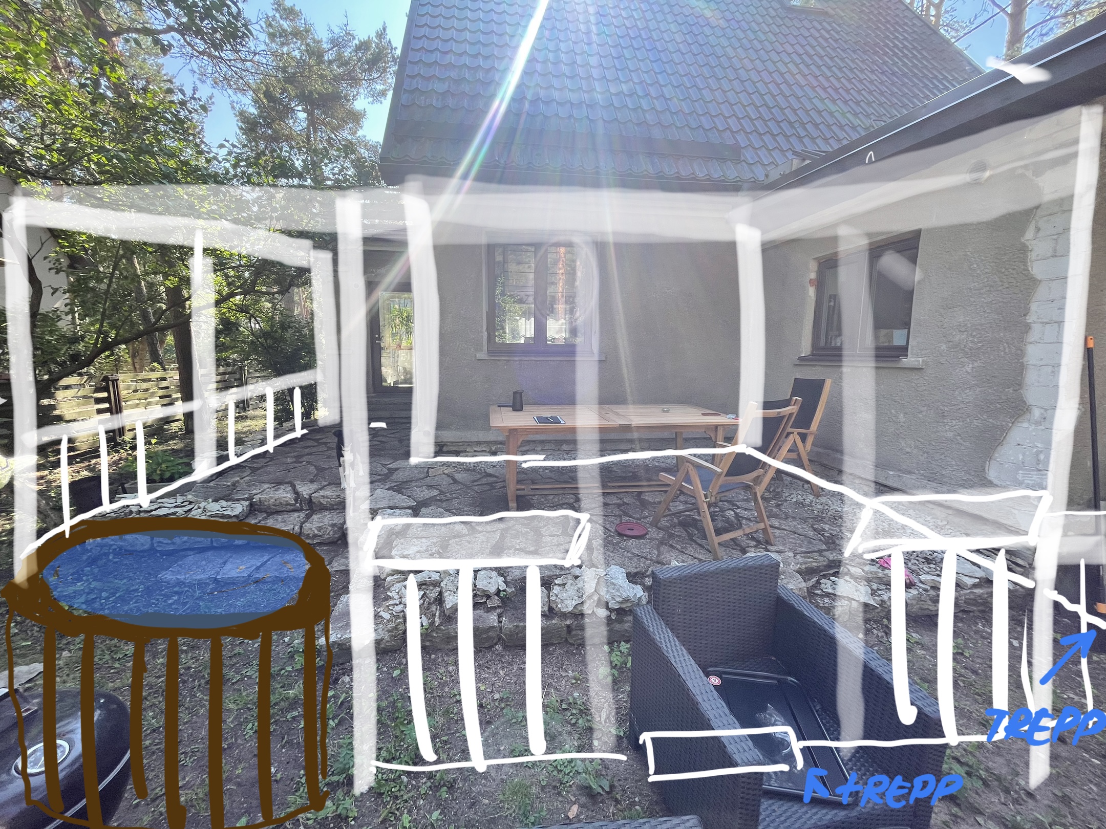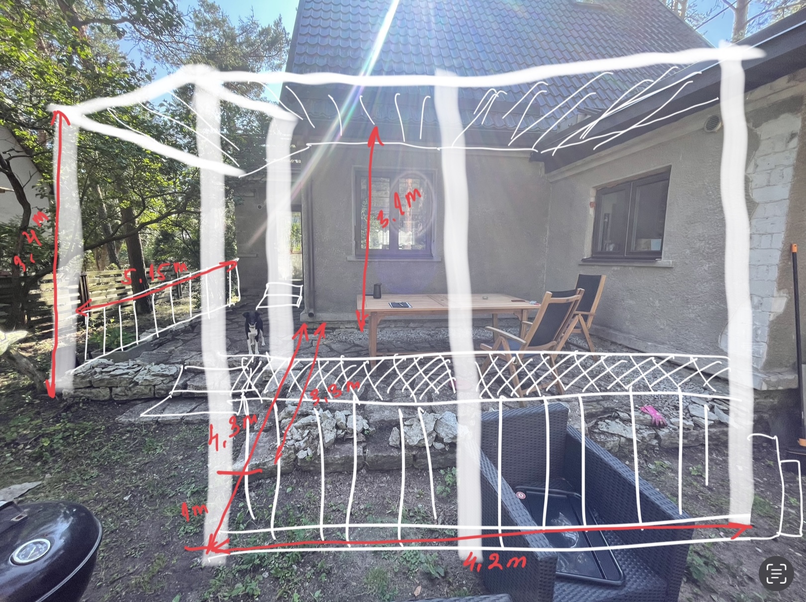 All paekivi, mille peale tuleb läbipaistva katusega, immutatud laudisest terrass, ühte nurka kümblustünn (idee tuli hiljem, näidatud lisanduval pildil). Terrassi ümbritseb piire. Manuses mõõdud ja umbkaudne nägemus terrassi ülesehitusest.