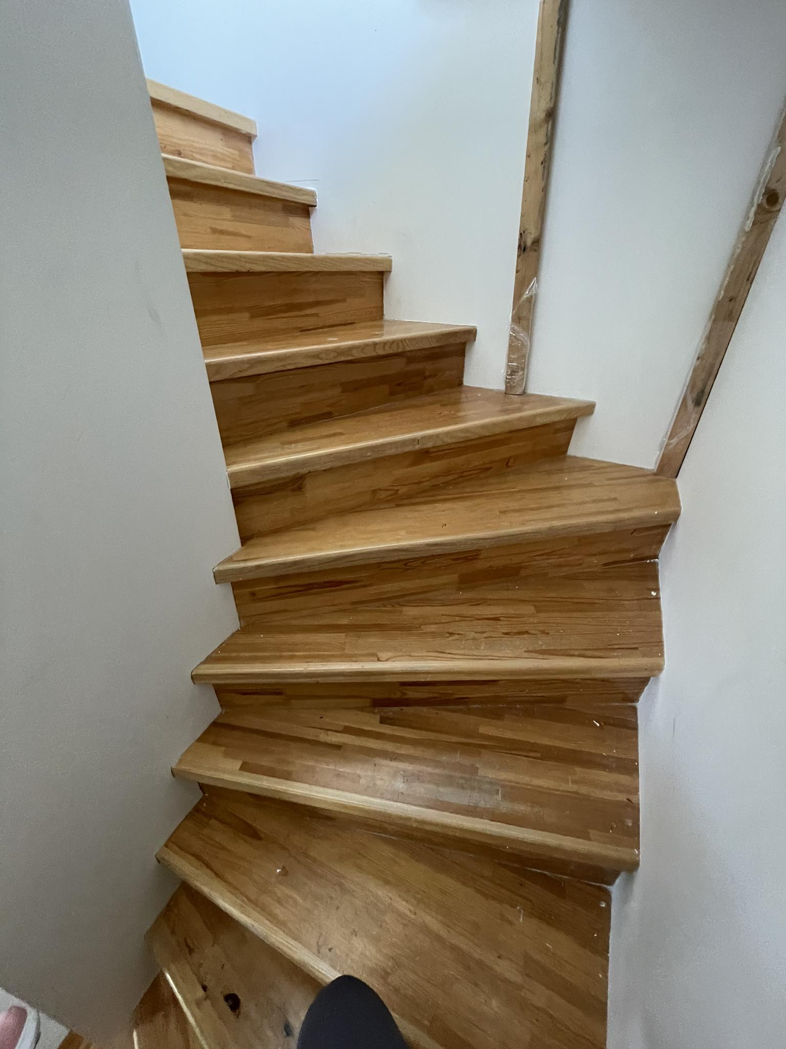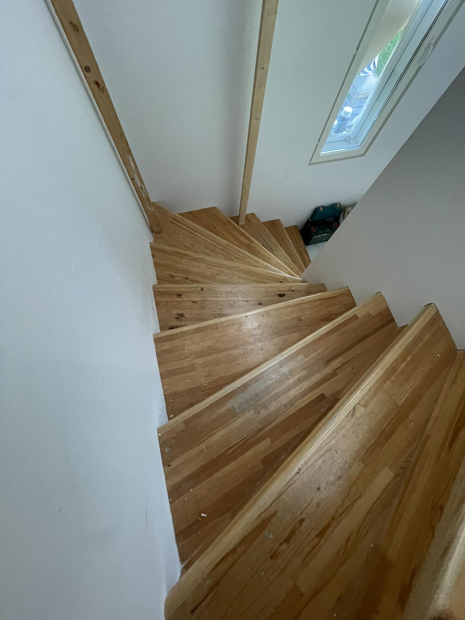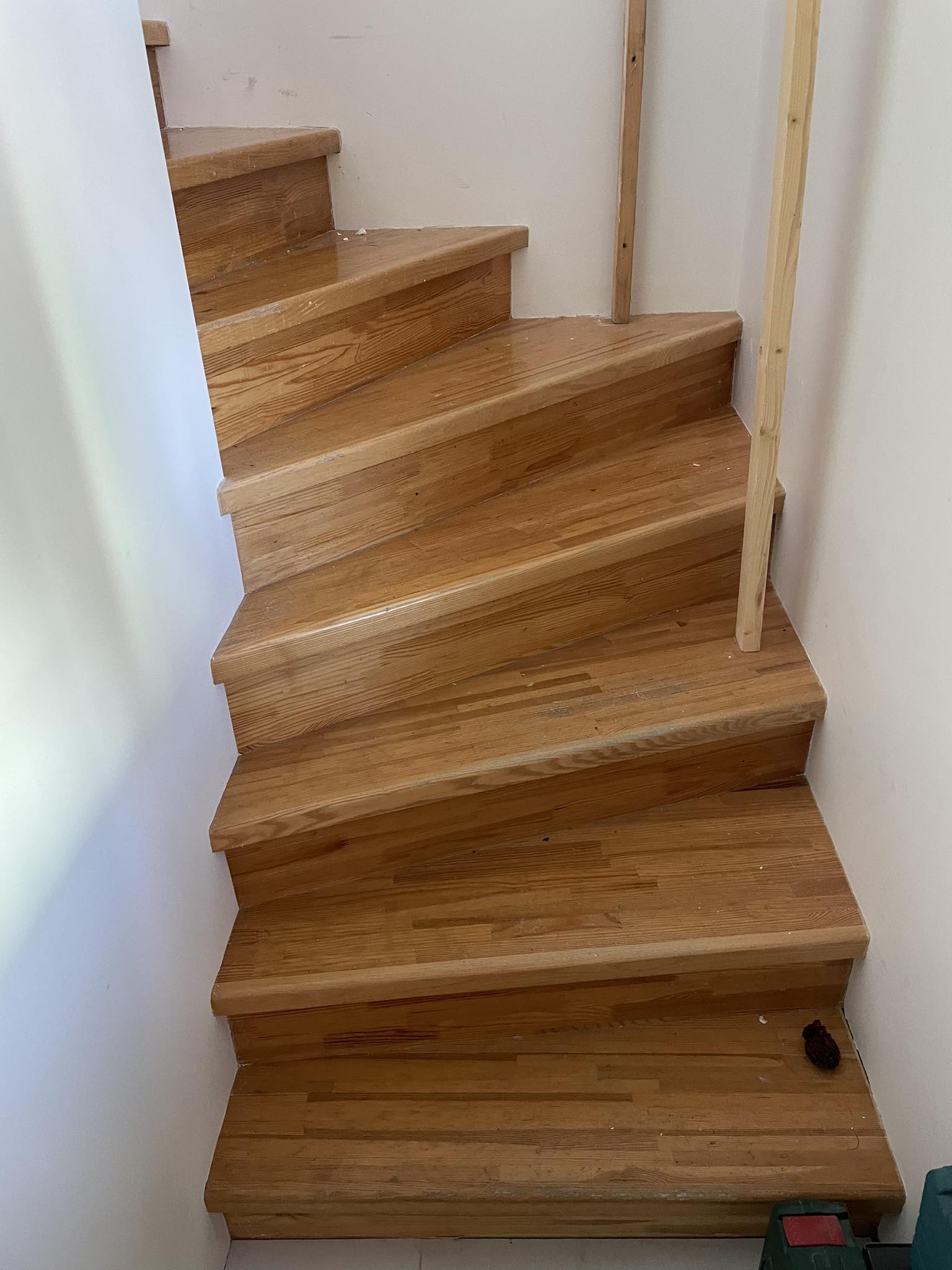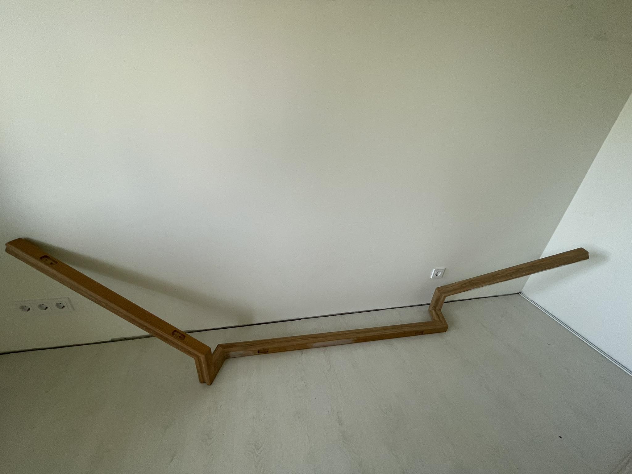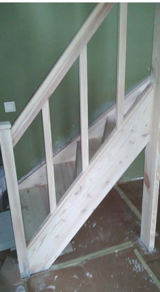 Vaja on fotodel olev trepp renoveerida. Lihvida täies mahus vana lakk ning ebatasasused maha, pahteldada ja uuesti valge tooniga põrandalakiga üle lakkida. Sama töö käsipuuga, mis on seinalt hetkel maha tõstetud remondi tööde jaoks.
