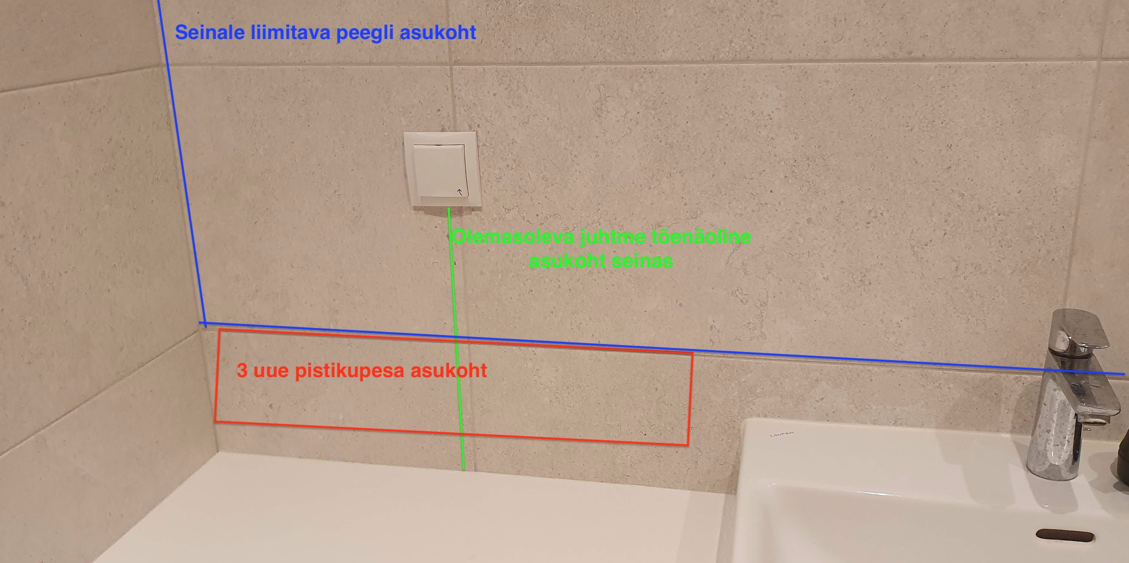 Soovin vannitoas oleva pistikupesa asukohta muuta ning ühe asemel panna neid 3 tükki. Põhjuseks see, et olemasolev pistik jääb paigaldatavale peeglile ette ning tulevikus on tarbijaid rohkem kui 1. Vt kaasapandud pilti praeguse ja soovitud olukorra kohta.