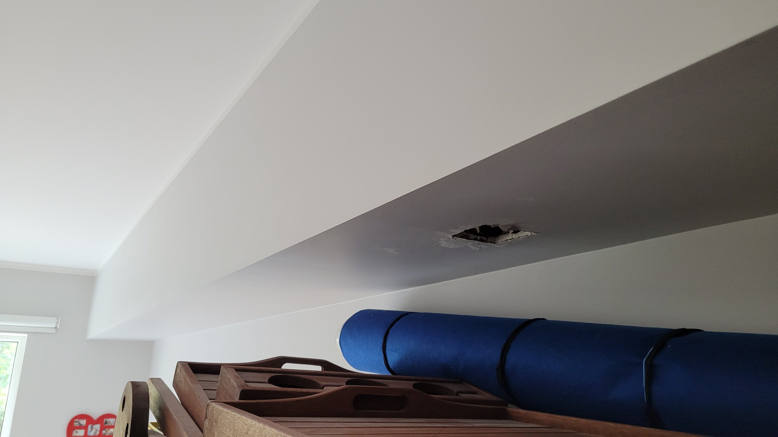 Ventilatsioonitoru isolatsioon on kuskilt lahti tulnud ning seeläbi tekitanud talvel kondevee kahjustuse. Oleks vaja lahti lõigata veidi kipsi, torule isolatsioon uuesti ümber panna, kips tagasi panna ning üle värvida.