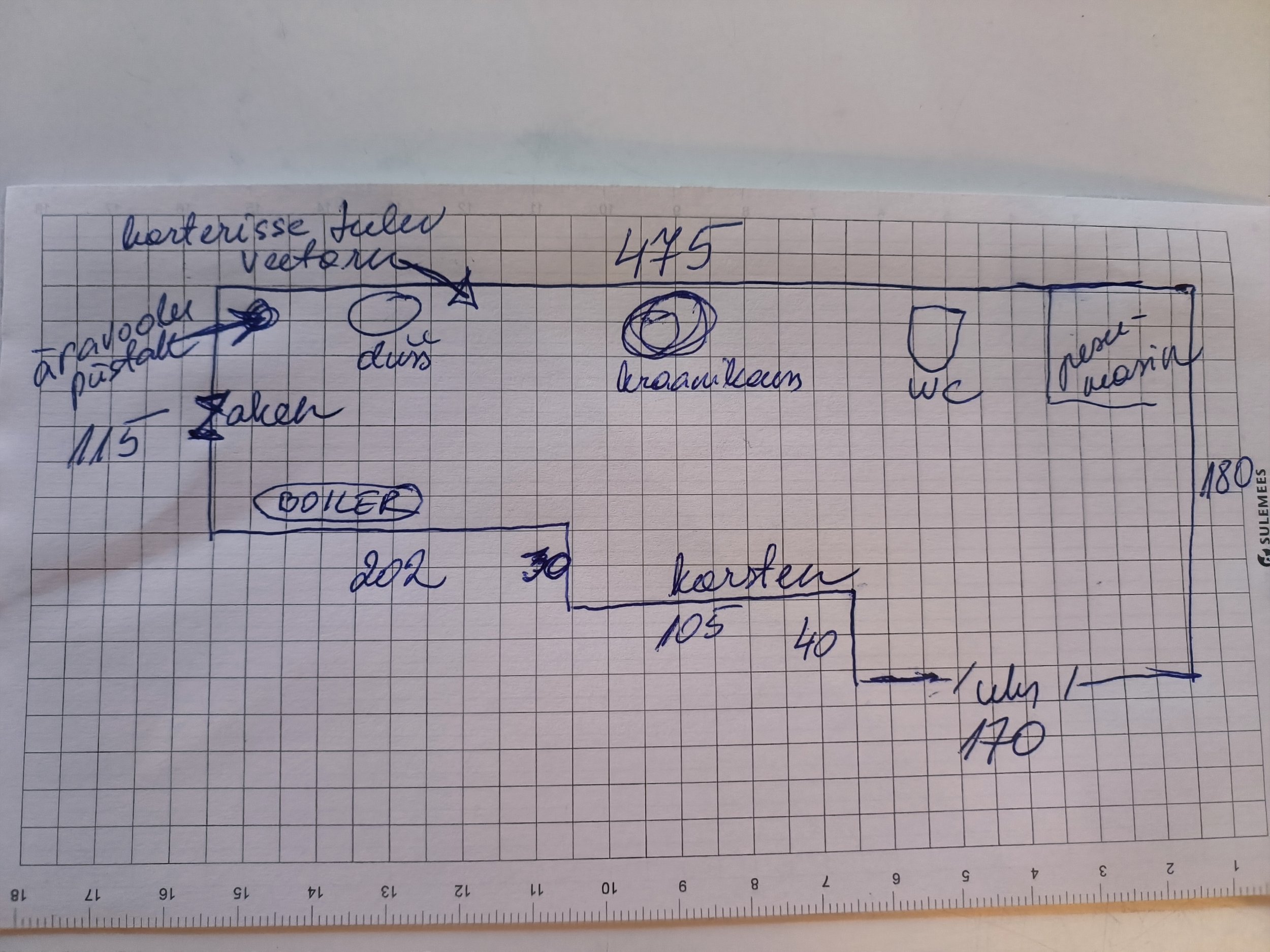 Nii veetorud kui äravoolutorud jäävad ühele seinale, seina pikkus ca 4,75 m.