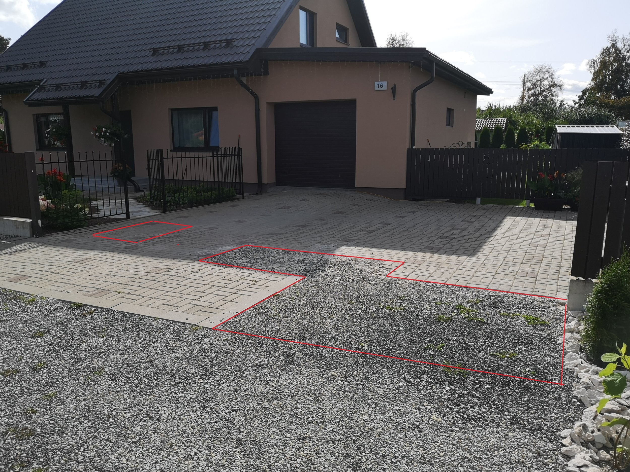 Meil oleks vaja täiendada olemasolevat parklaplatsi tänavakividega. Lisan pildi, kus paremal poolel on puuduv ala punase joonega ümbritsetud. Samuti võiks natuke tõsta ühte lombi kogunemise kohta olemasoleval osal (pildil vasakul poolel punase joonega ümbritsetud).