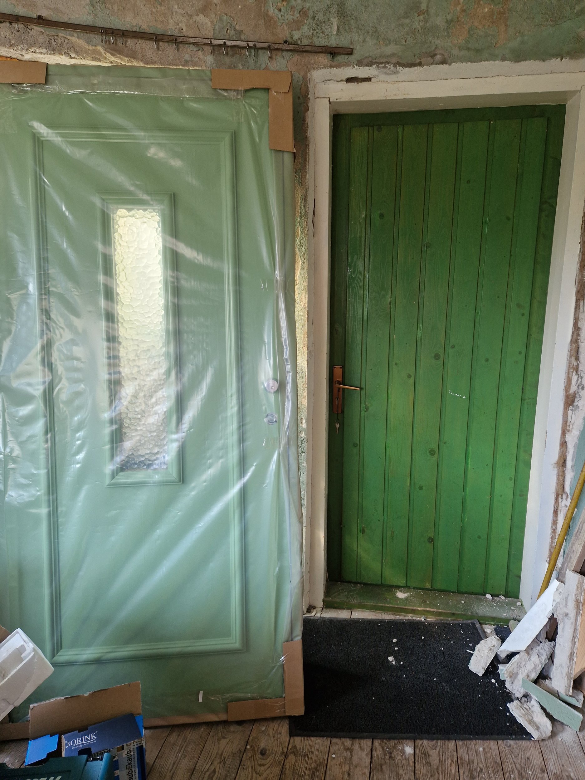 Kahe välisukse vahetamine eramajal. Vanad uksed tuleb eemaldada ja uued asemele panna, korrastada uste ümbrus.