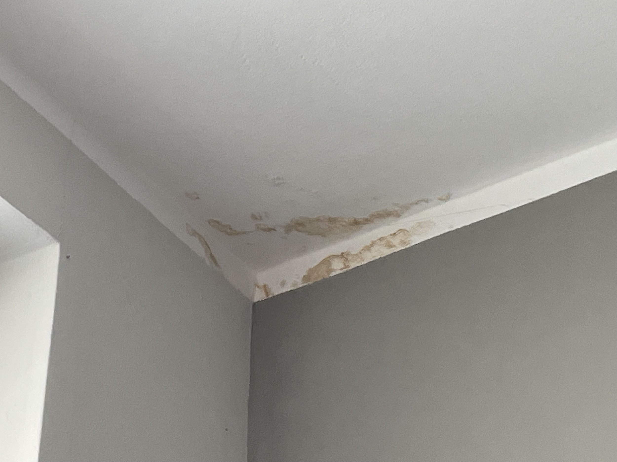 Lisatud on veega kahjustatud koht ja katuse pilt selles kohas. Lamekatus, kaetud PVC kattematerjaliga.