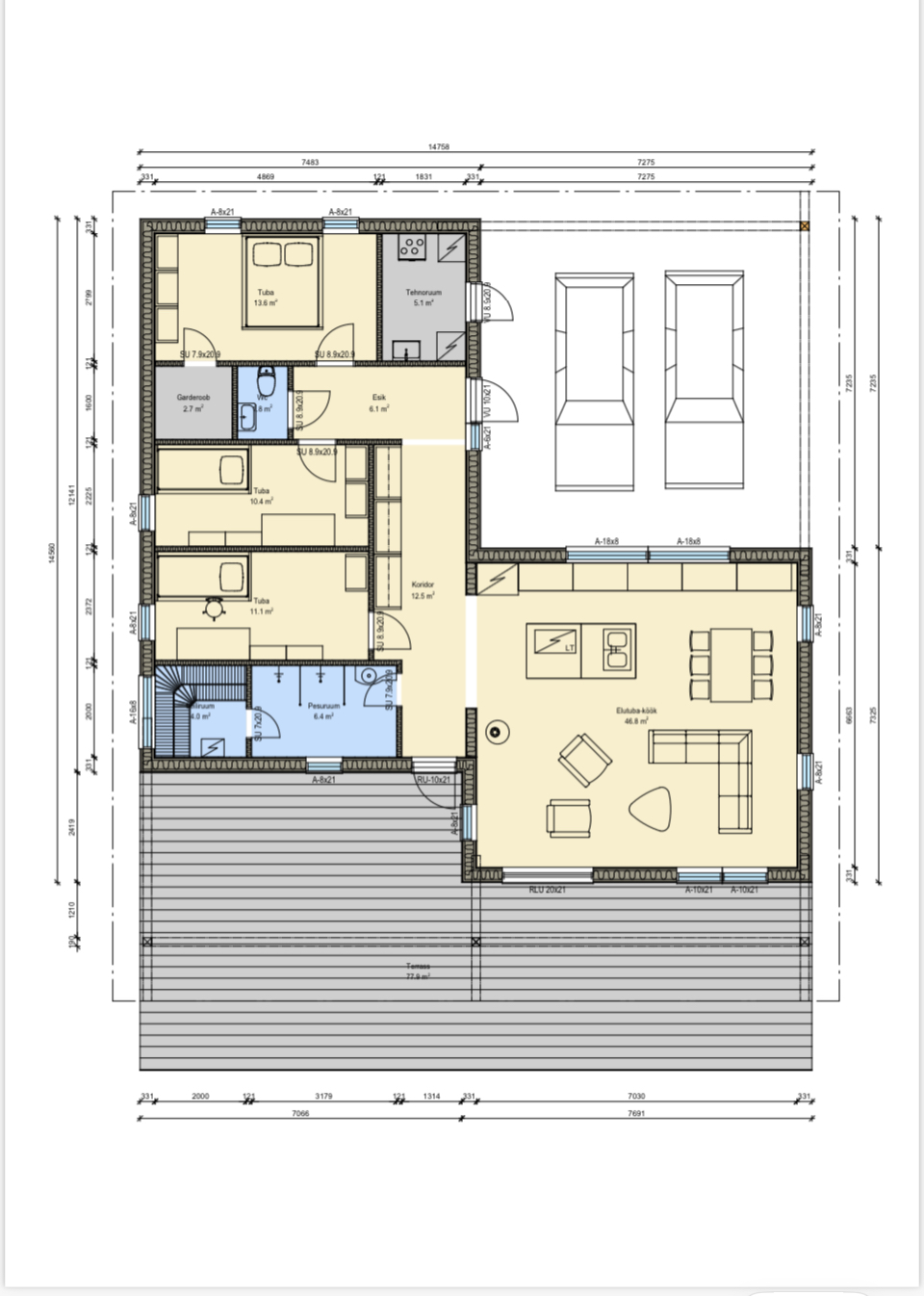 Maja üldpind on 130 m2 ja ühekordne- 3 magamistuba, köök, elutuba, dušširuum ja wc, esik,