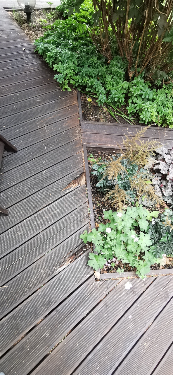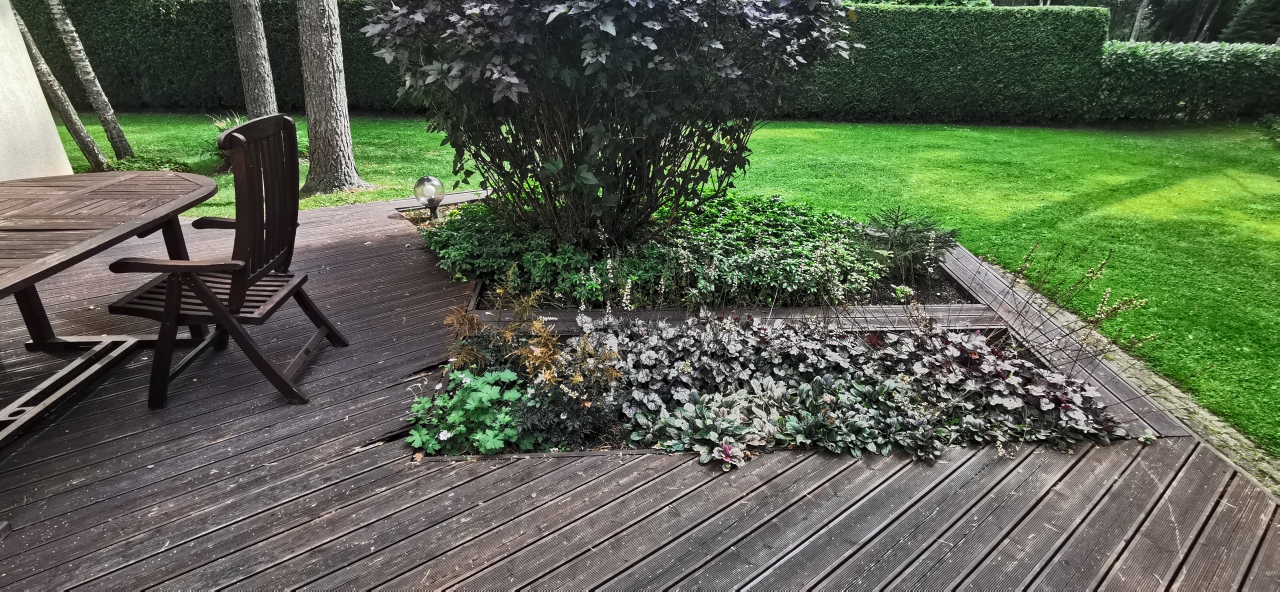 Terrassi sees on istutusalad, nende ümbert on terrass ära mädanenud - oleks vaja mädanenud jupid asendada uutega (ilmselt ca kahe laia terrassilaua laiuselt). Istutusalade ümbrus on ehitatud Fibost, ülejäänud terrass nii nagu terrass ikka - postidel-prussidel