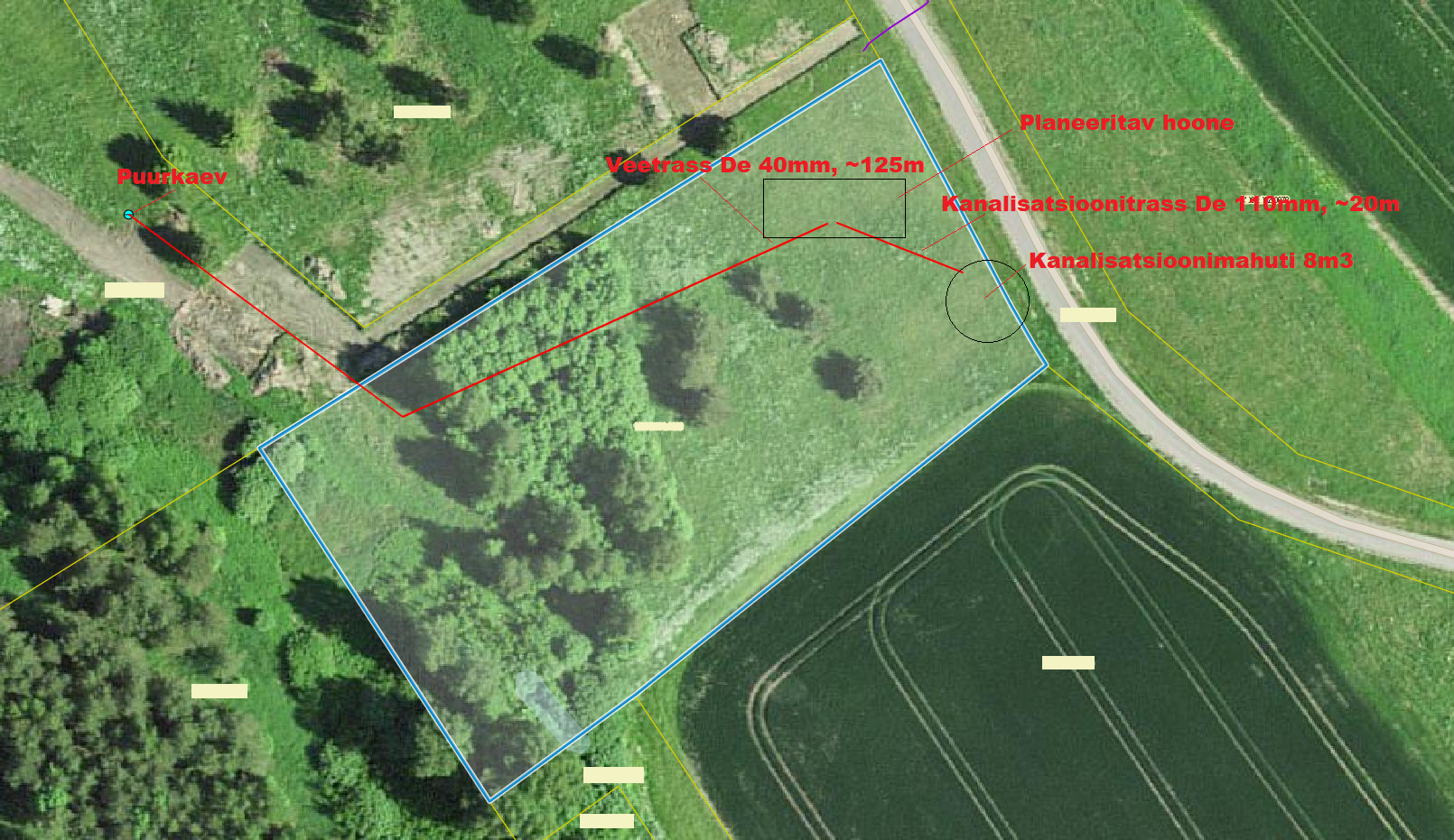 Sooviks teostada vee ja kanalisatsioonitrassi ehitamist. Pakkumine peaks sisaldama puurkaevu pumpa, veetrassi, kanalisatsioonitrassi, veesõlme ja kinnistu kanalisatsiooni mahuti paigaldamist.