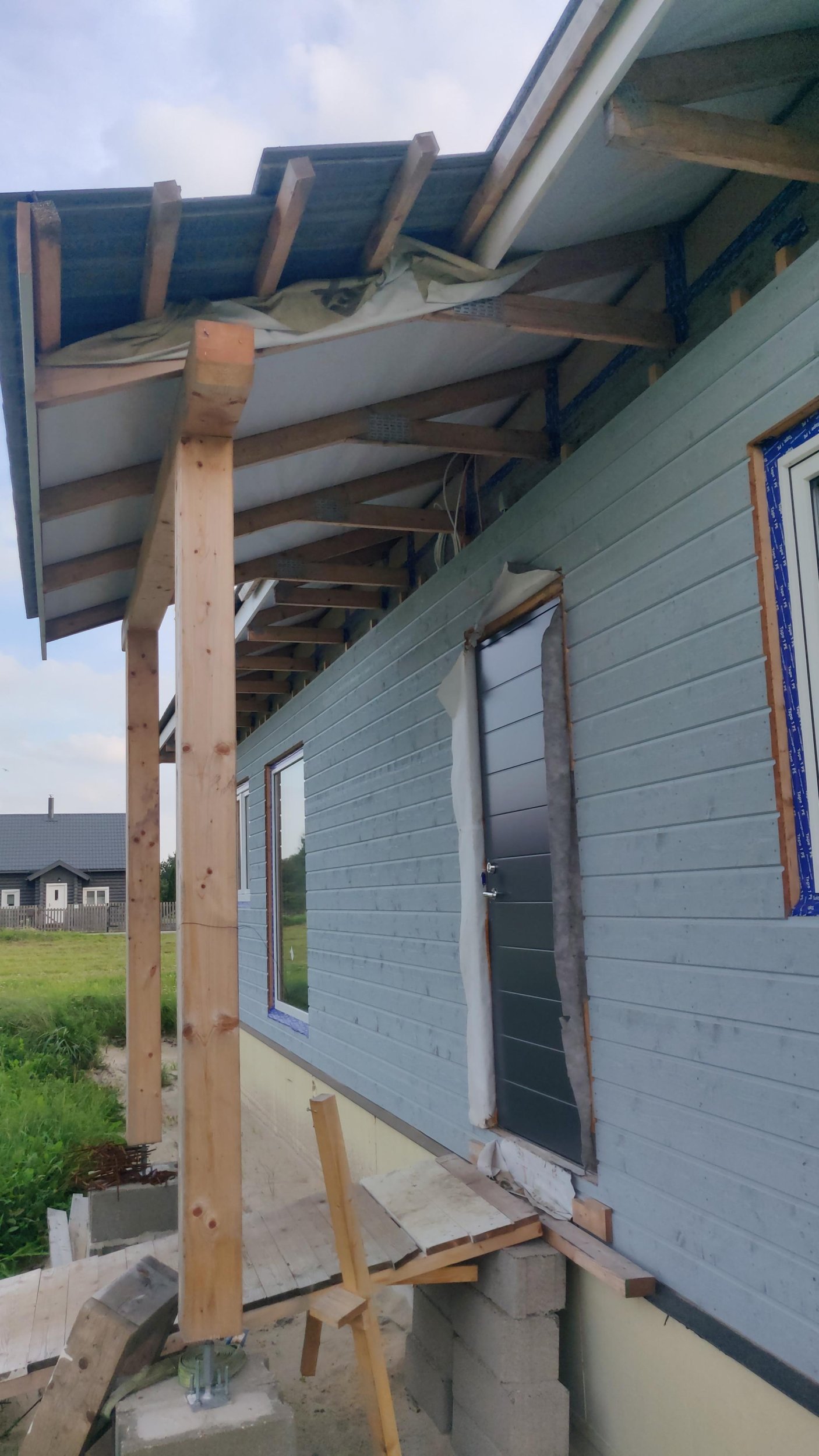 Maja esise varikatuse laudise paigaldus ja varikatuse kivikatuse lõpetamine