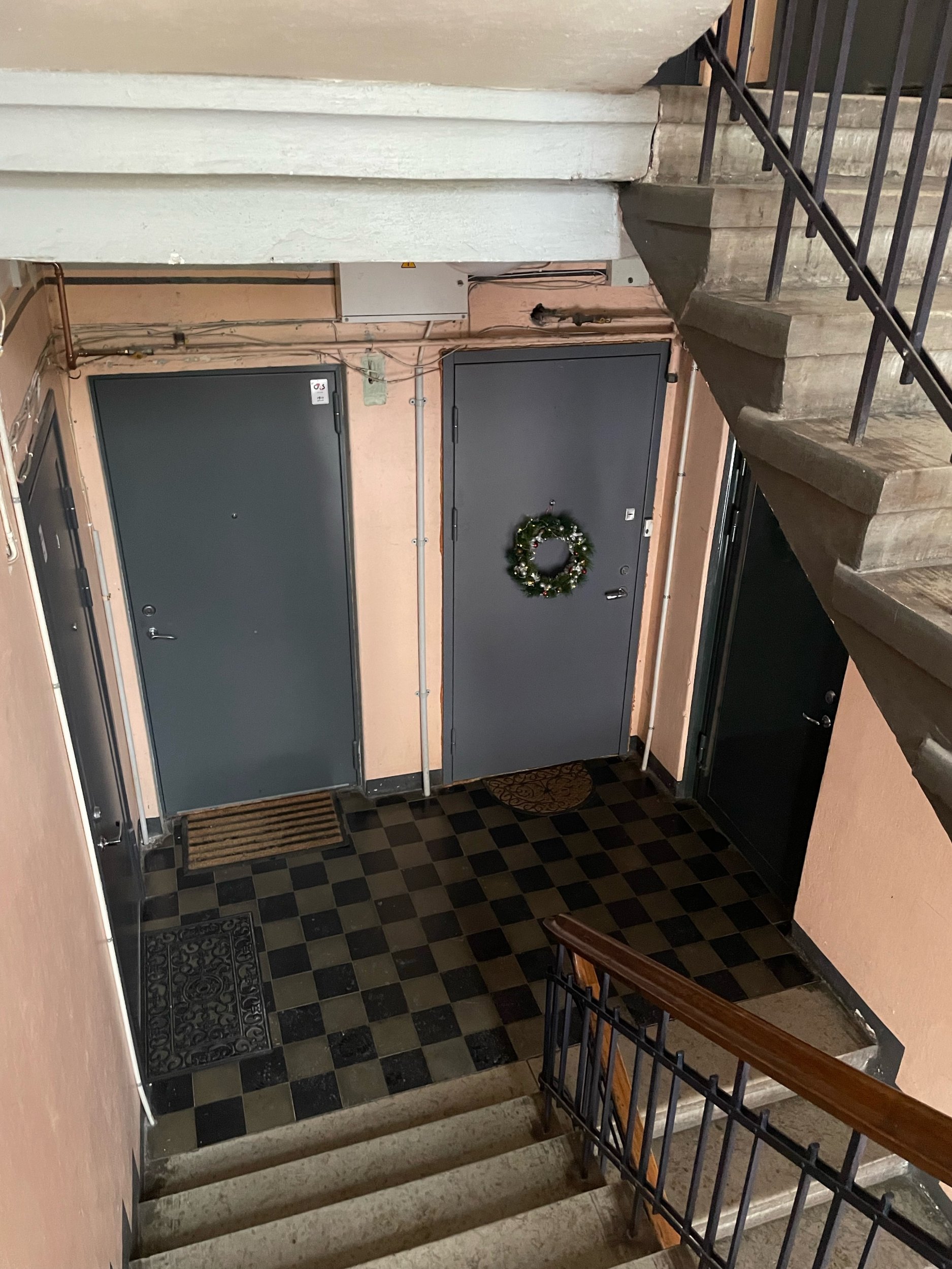 Trepikojas on kolm korrust. Igal korrusel on neli korteriust. Uste ümbruses on seintel erinevaid juhtmeid: elektri, side ja televisioonijuhtmeid. Esialgses versioonis jääb enamus neid puutumata kujul seinale (karbikud peale). Korteri uksi ei värvita. Tänavapoolses seinas on 6 m kõrgune ja 1 meetri laiune aken, akna ümbrus on vaja krohvida ja paigaldada tõkkekäsipuud, mis on olemas. Trepikoja seinal on vajadusel teha pisiparandusi pahtelduses. Trepimademel enne pööningut on seinal niiskuskahjustused - ca 9 m2.