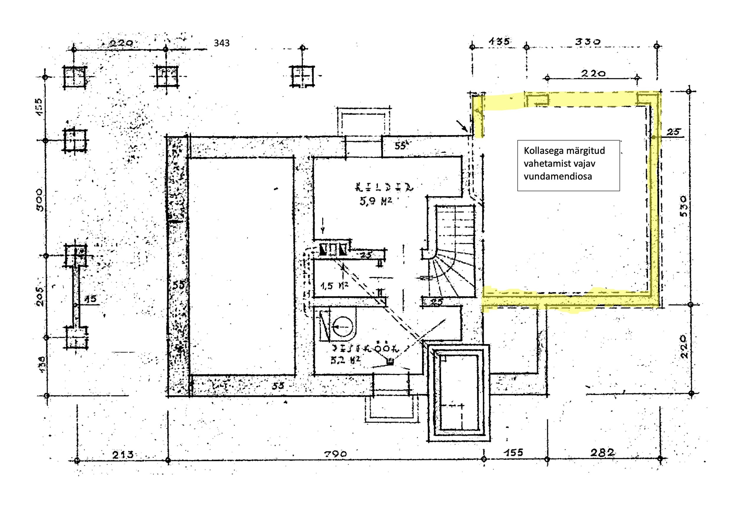 Lisaks on majandusruumidega maja osas (madalam osa) vajalik eemaldada ja utiliseerida välimine vana vundament, mis on 25cm laiune betoonist (kõrgus u. 45cm) + lahtistest maakividest (kõrgus u. 50cm) (maakivid jääks krundile). Kogupikkus u. 15,5m. Kaevetööd tellija poolt.