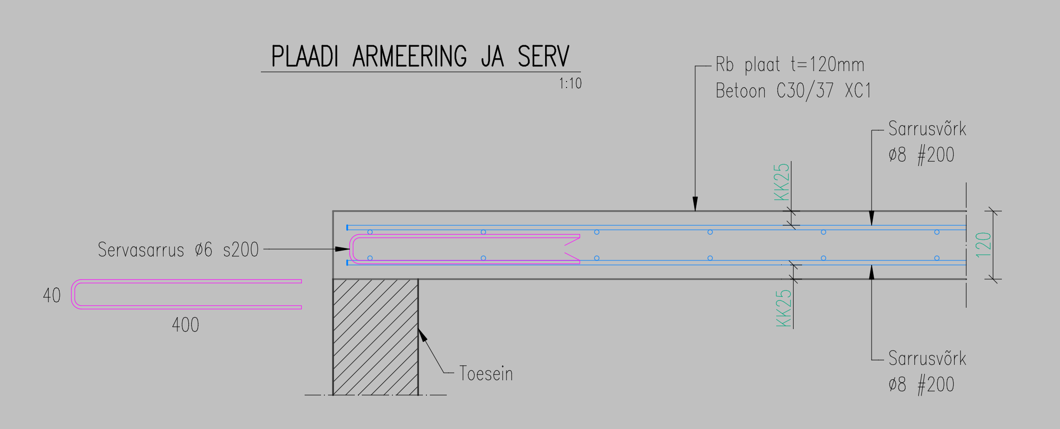 Piltidel olev vaheseina otsa kandev terastala jääb osaliselt (ca 6cm) betoonplaadi sisse. Arvutus tehtud eeldusel, et betoonplaadi ülemine serv on maksimaalselt kõrgel, et peale minevad kihid (50mm soojustus, ~70mm vesiküttega betoonpõrand, parkett) ära mahuks. Tõenäoliselt on plaati võimalik vajadusel pisut allapoole lasta.
