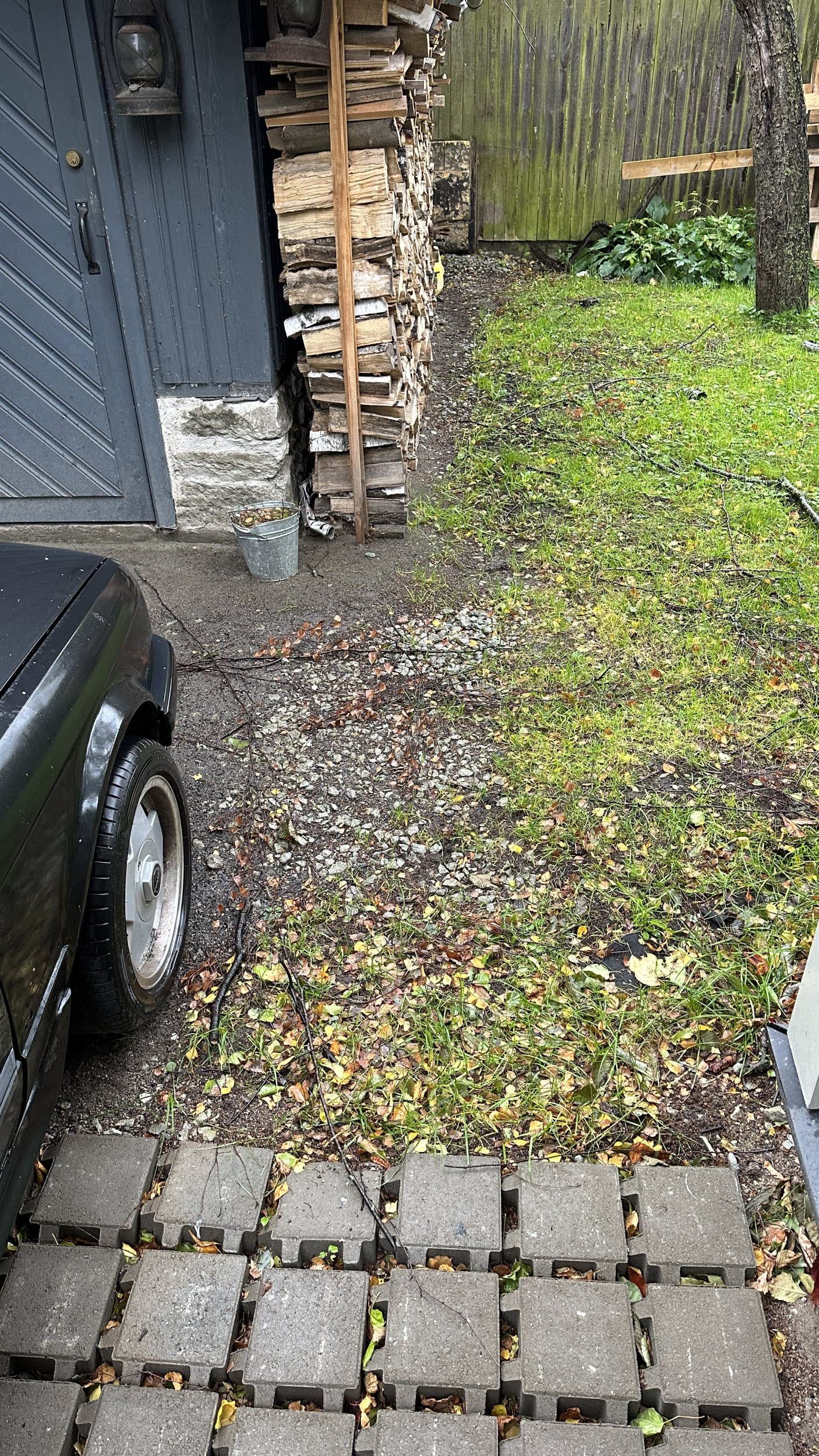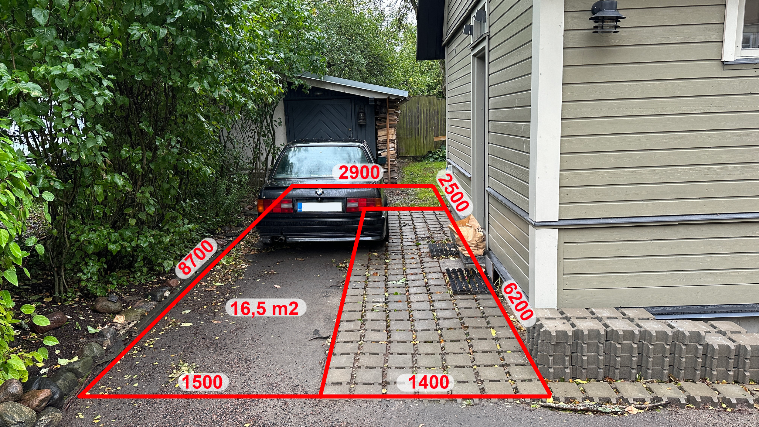 2) Tänavakivide paigaldus auto parkimiskohale. See hõlmab endas: vana täitematerjali eemaldus ning äravedu, uue aluspinna ettevalmistus, tänavakivi ladumine. Ala 16,5 m2. Lisaks on ca 1,5-2 m2 vaja uuesti laduda, sest on paigast nihkunud (vt eraldi foto). Kokku on plats 25 m2, millest on 8,6 m2 laotud.