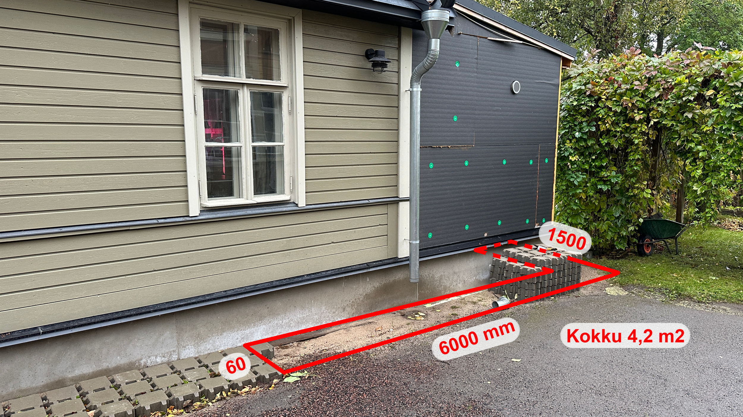 1) Tänavakivide paigaldus maja serva. Aluspind on ette valmistatud, aga natuke on vaja alla liiva tasandamiseks juurde tuua. Kokku 4,2 m2.