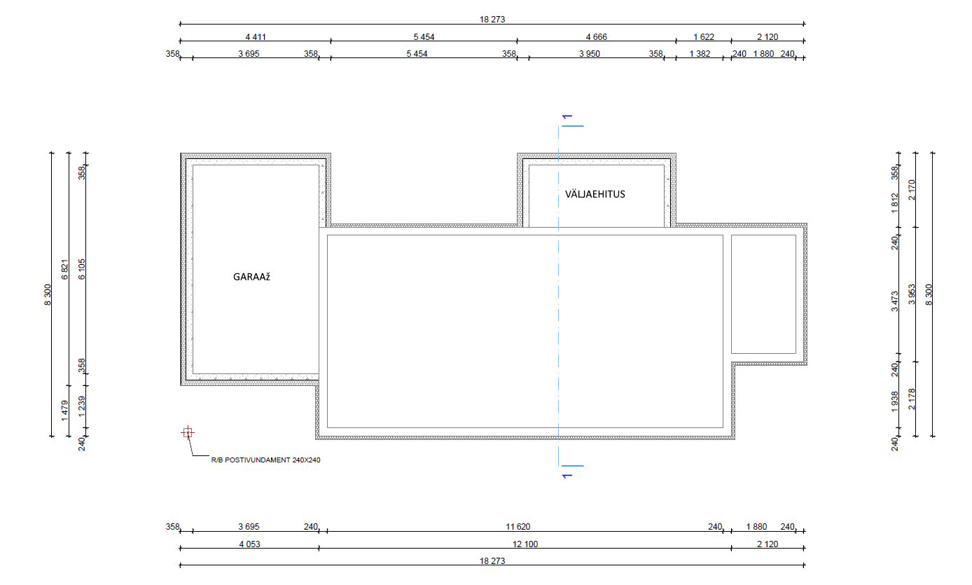 23,3 m2 garaaž ehitatakse ühe pikiseinaga osaliselt vastu puitkarkass elumaja. Välismõõdud 4411 x 6821. Kaks 1200 x 800 aknaava. Katus ulatub garaaži ette ja toetub tugipostile. Teostatavad tööd: pinnase kaevamine ja äravedu, soojustatud Fibo 250 vundament, tagasitäide, 200 mm Bauroc plokkseinad, 15-20° kelpkatuse karkass, tugipost, ajutine katusekattematerjal.